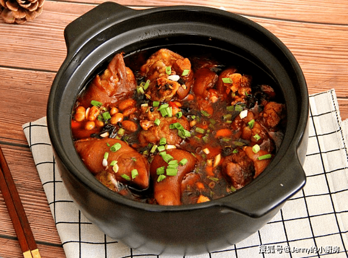 最后去掉葱结,将猪蹄和汤汁装进砂锅内,大火将砂锅烧热,就可以关火了。