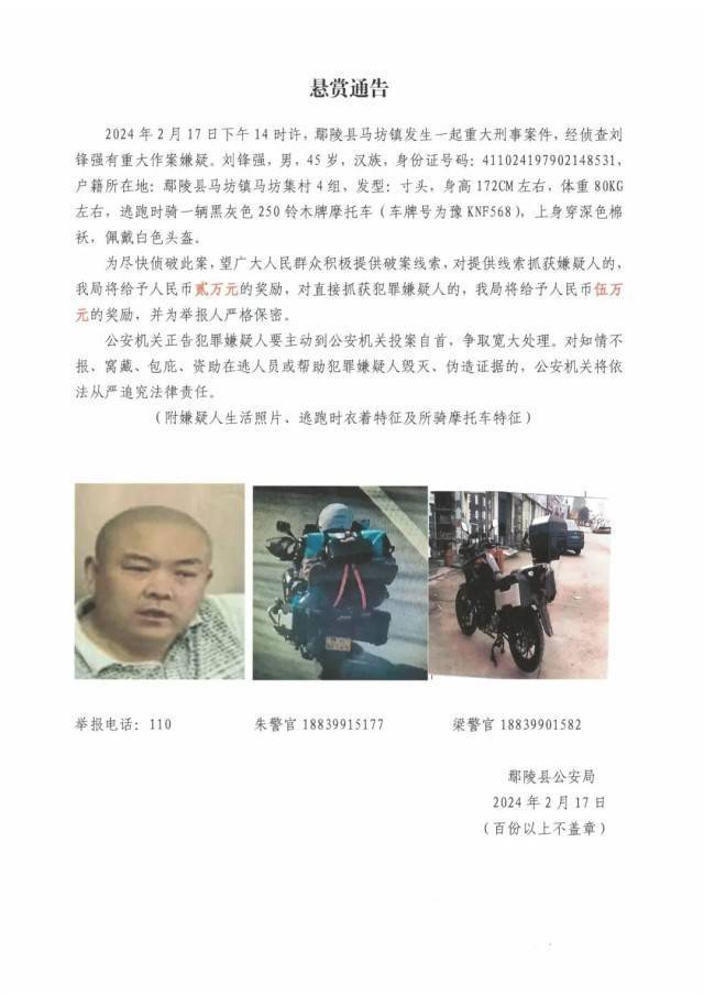 央视网消息:据河南鄢陵县公安局官微消息,2月18日该公安局发布悬赏通告称,2月17日下午14时许,鄢陵县马坊镇发生一起重大刑事案件,经侦查刘锋强有重大作案嫌疑。刘锋强,男,45岁,汉族,身份证号码:411024197902148531,户籍所在地:鄢陵县马坊镇马坊集村4组,短发,身高172CM左右,体重80KG左右,逃跑时骑一辆黑灰色250铃木牌摩托车(车牌号为豫KNF568),上身穿深色棉袄,佩戴白色头盔。