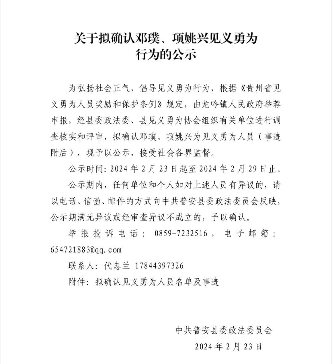 2月23日,普安县委政法委发布公示,拟确认牺牲的邓璞(1995年8月出生,红旗社区居委会副主任)、项姚兴(2001年4月出生,吟塘村委会村民)为见义勇为人员。