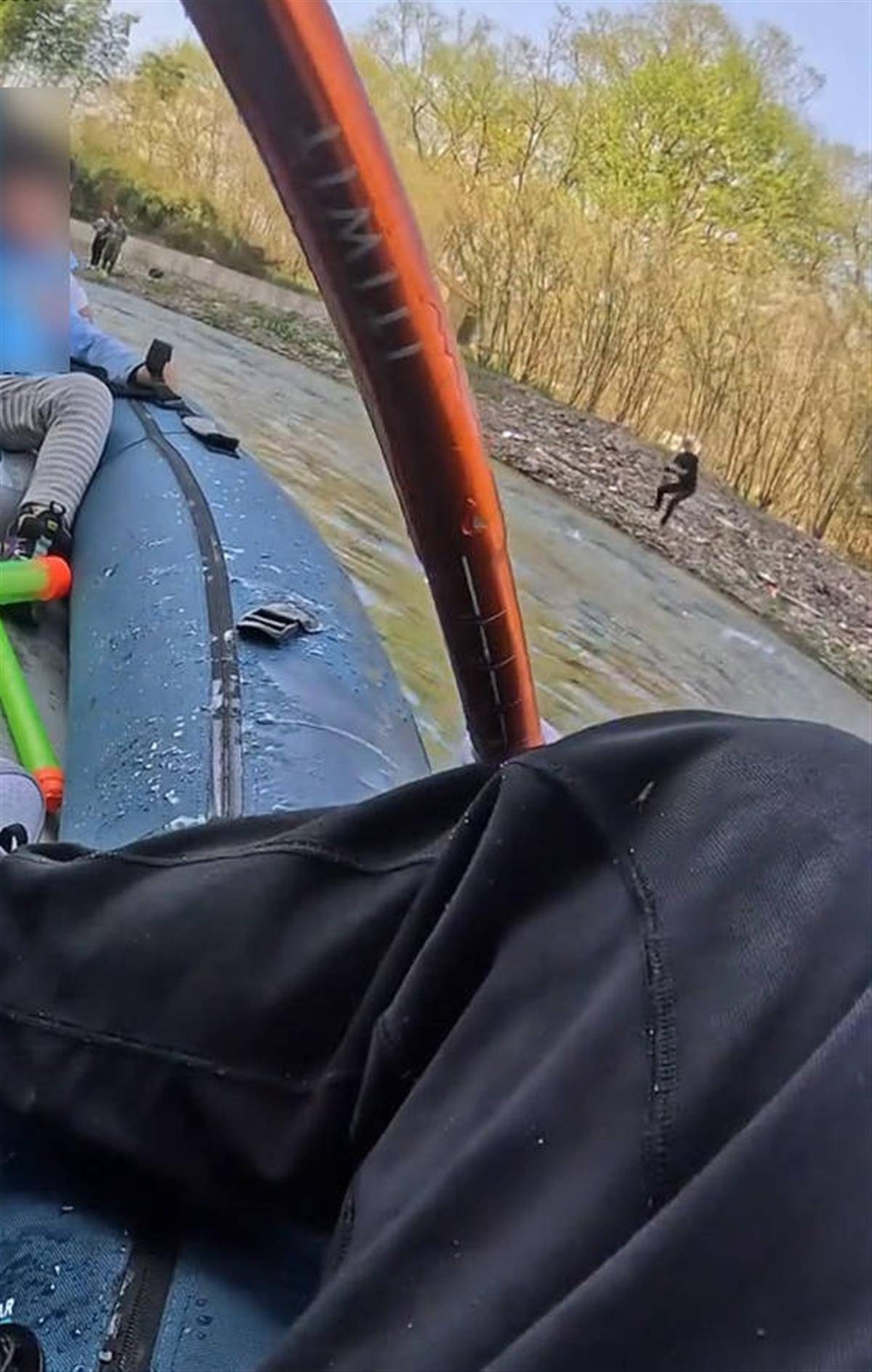 视频显示,在一河道内,一名男子和两个孩子正在划皮划艇,河岸上停着几辆汽车,岸上有人员不断朝着皮划艇投掷石头,并大声催促男子上岸,投掷的石头就落在距皮划艇不远处。