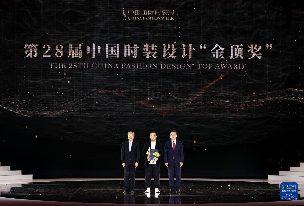 9月13日,嘉宾为中国时装设计“金顶奖”获得者陈宇(中)颁奖。