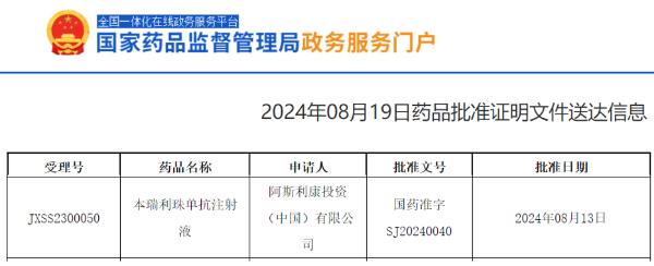8月20日,阿斯利康宣布,凡舒卓(通用名:本瑞利珠单抗注射液)已获得中国国家药品监督管理局正式批准,用于成人和12岁及以上青少年重度嗜酸粒细胞性哮喘(SEA)的维持治疗。
