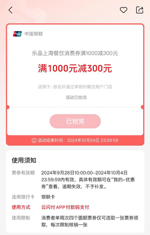 9月28日,第一轮“乐·上海”系列服务消费券发放。上午10点,位于上海市浦东新区中国银联唐镇园区的实时交易监测大屏迎来瞬时交易高峰,近百万用户同时在线抢券。短时间内,“乐品上海”餐饮消费券与“乐游上海”住宿消费券都被全部领完。而在领券开始后的15秒内,第一张“乐品上海”餐饮消费券于星巴克门店被核销使用,27秒内,第一张“乐游上海”住宿消费券于上海城景酒店管理有限公司核销使用。