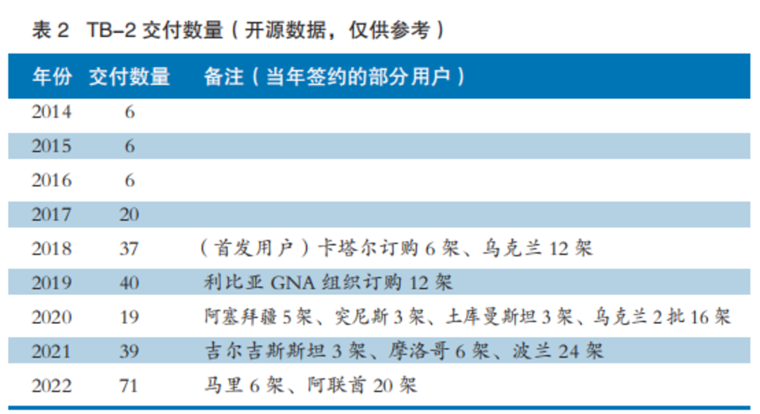 (三)全面推进(2020年~至今)TB-2介入叙利亚、利比亚战争的表现,特别是与俄制防空系统的抗衡,加之无人机战术日渐成熟,开始让人们对土耳其无人机刮目相看。纳卡战争中,阿塞拜疆的TB-2无人机机队的有效运用,尤其是阿塞拜疆国防部在社交媒体上展示TB-2对亚美尼亚的坦克、装甲车以及防空系统的攻击视频,使TB-2得到高度关注并且销量直线上升(表2)。借助TB-2战争形象,土耳其一方面不断拓展无人机交易版图,积极开拓欧洲市场,如波兰于2021年5月采购24架,成为首个签单的北约盟国;另一方面也不忘非洲这个新兴的无人机市场,比如尼日利亚购买TB-2外,双方还达成了在能源、油气和采矿领域的合作,实现了军贸溢出效应。从2015年的无人问津到2020年的供不应求,其推动力就是TB-2无人机在利比亚、叙利亚和纳卡冲突的突出表现。土耳其以积极进取、务实行动实现着中等强国的战略诉求,逐步确立着世界无人机出口大国的地位和身份。
