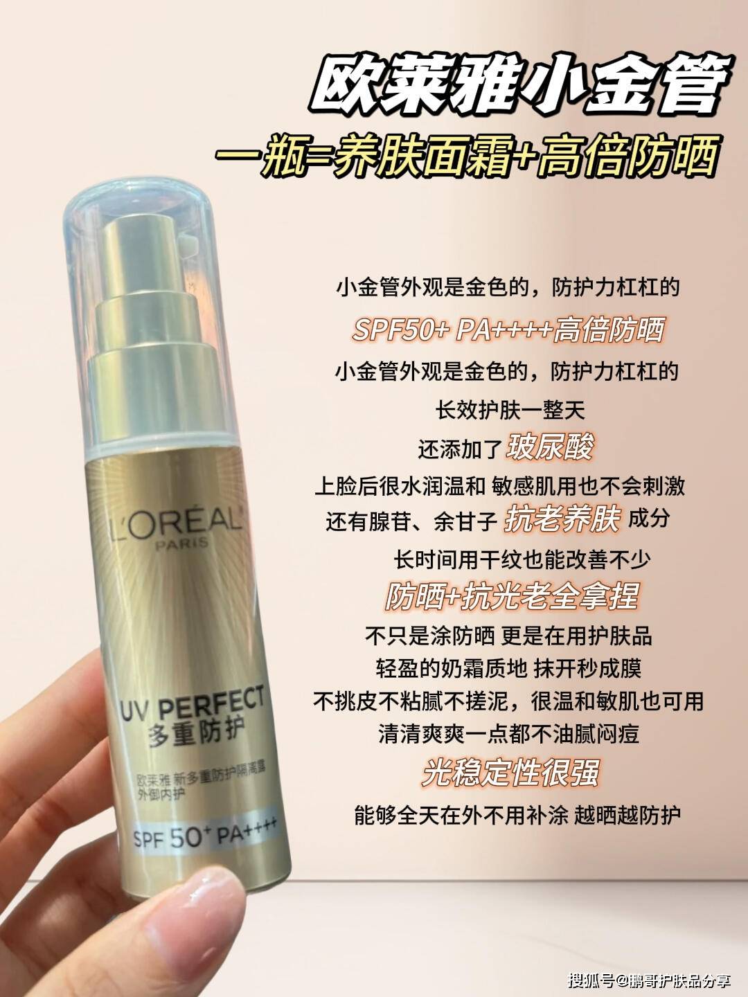 小金管外观是金色的,防护力杠杠的,SPF50+、PA++++高倍防晒,可以长效护肤一整天,还添加了玻尿酸,上脸后很水润温和,敏感肌用也不会刺激,还有腺苷、余甘子抗老养肤成分,长时间用干纹也能改善不少。