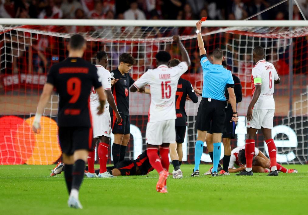 9月19日,主裁判在比赛中向巴塞罗那队球员埃里克·加西亚出示红牌。新华社/路透