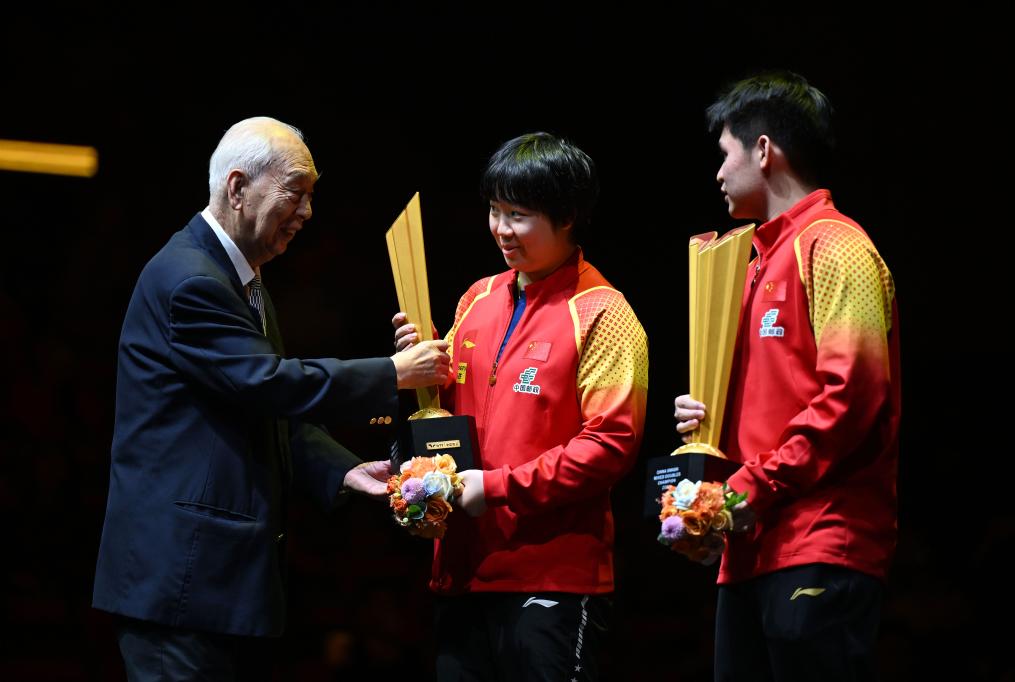 颁奖环节,乒乓球世界冠军、刚获颁“体育工作杰出贡献者”国家荣誉称号的张燮林为林诗栋/蒯曼颁发了冠军奖杯。