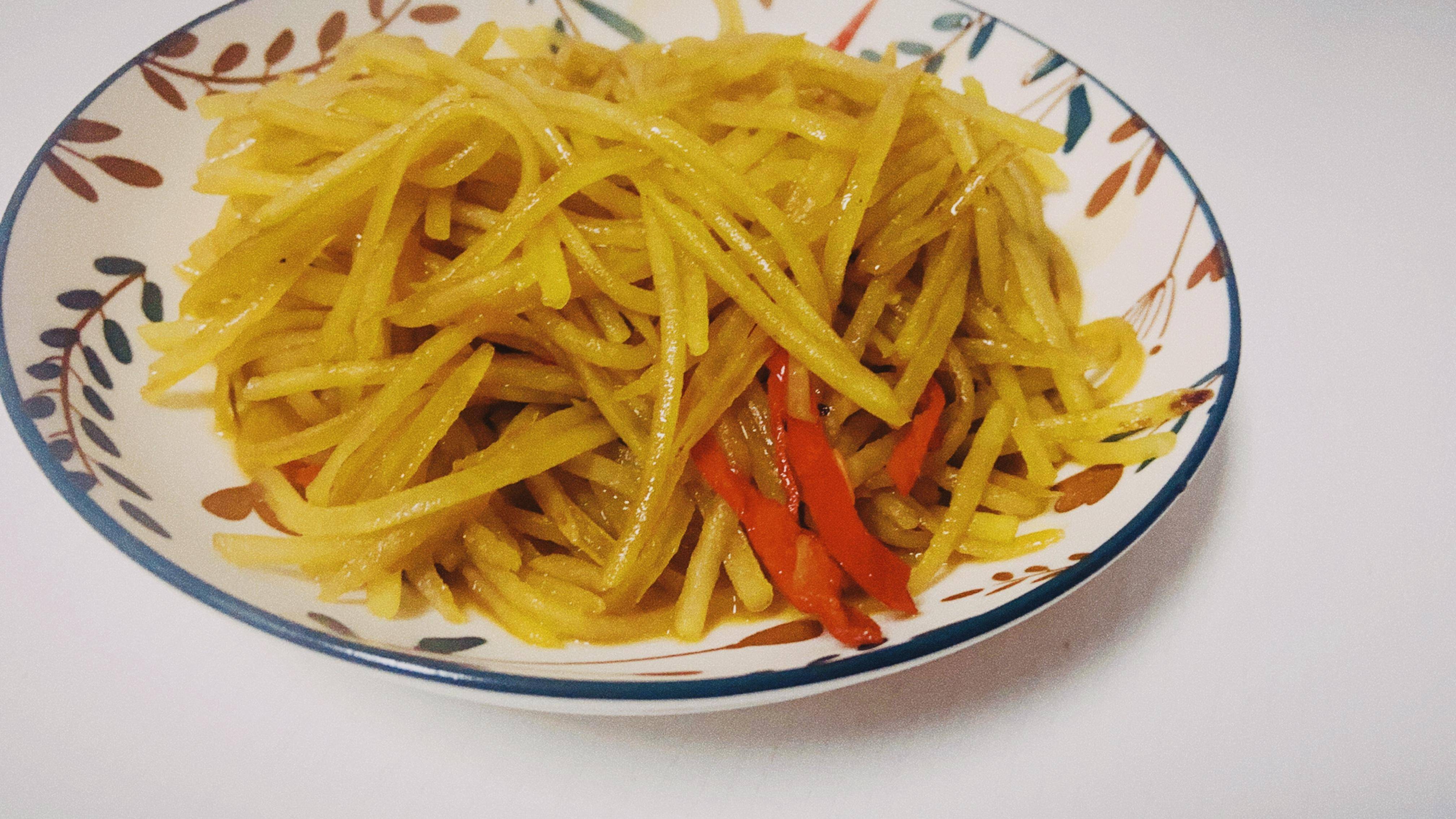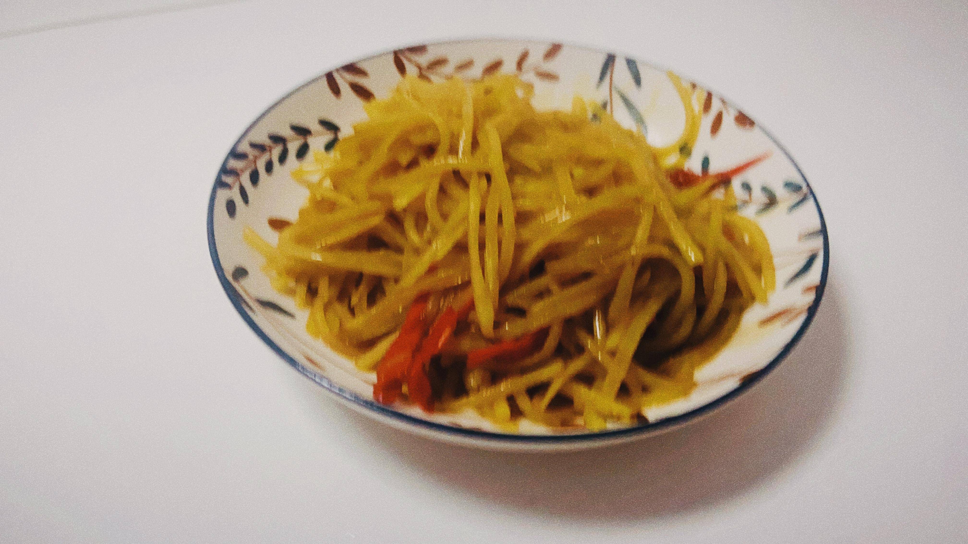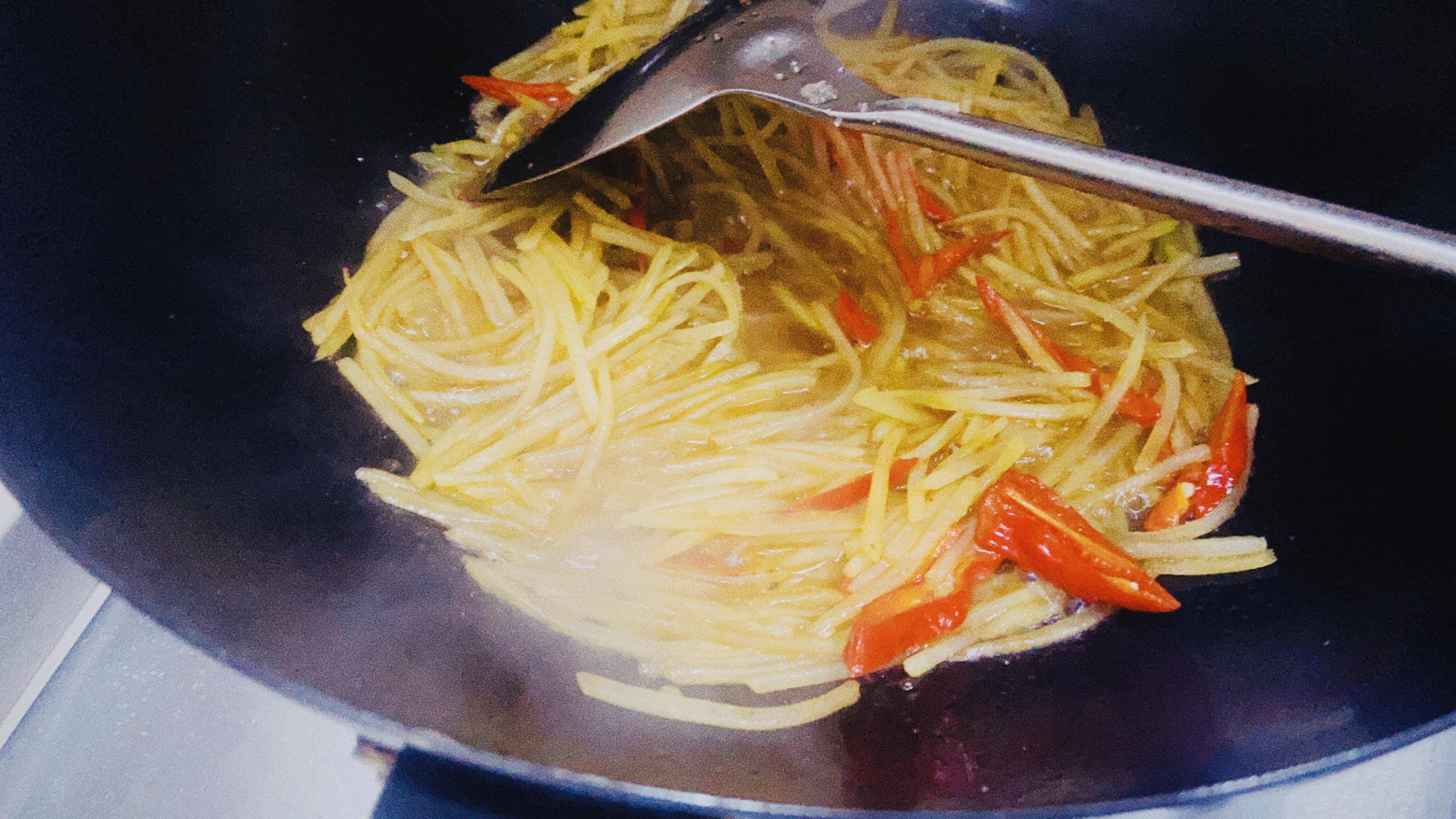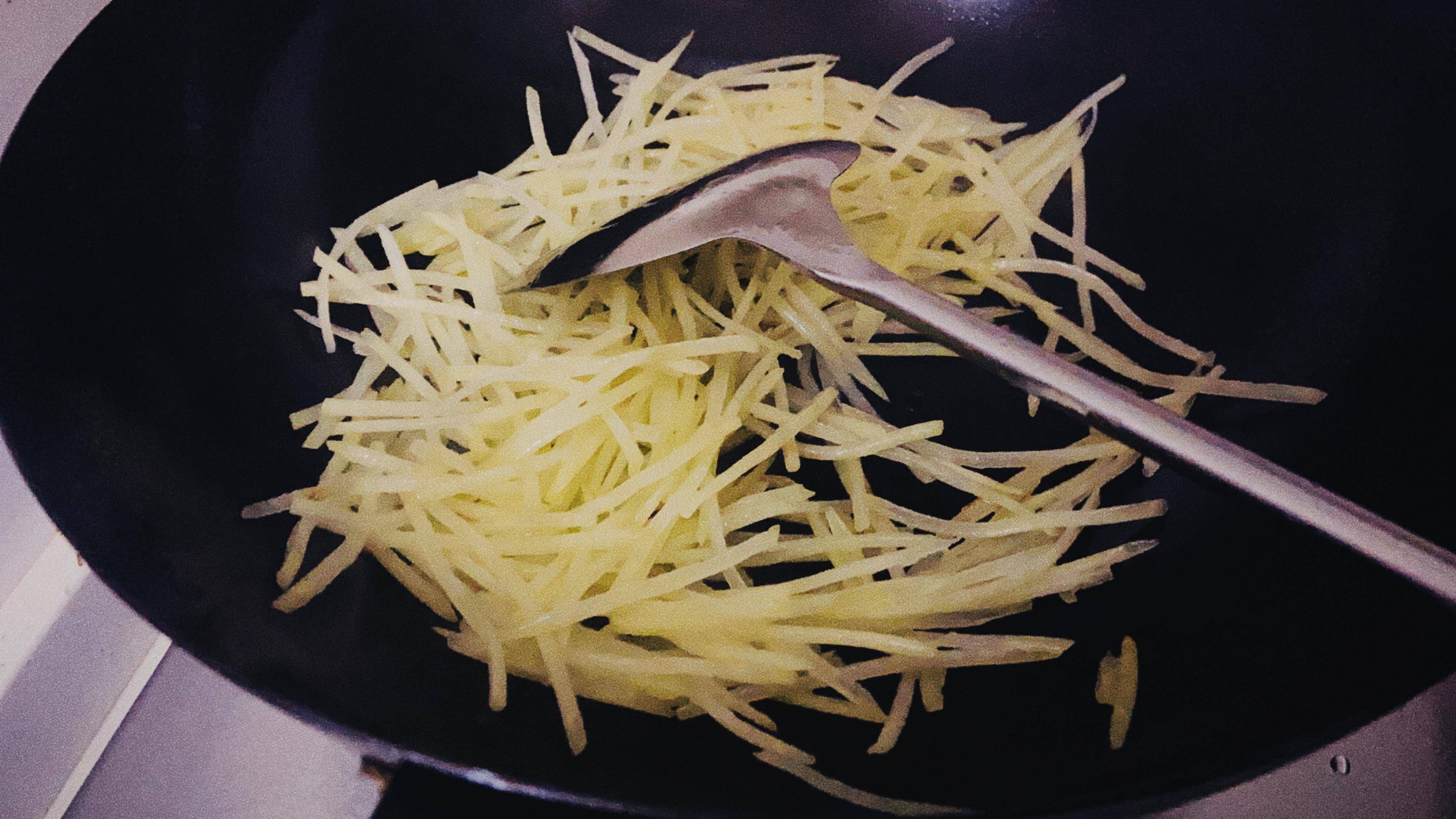 泡好的土豆丝用清水多冲洗几遍,红皮土豆里面的相对来说红白一点。