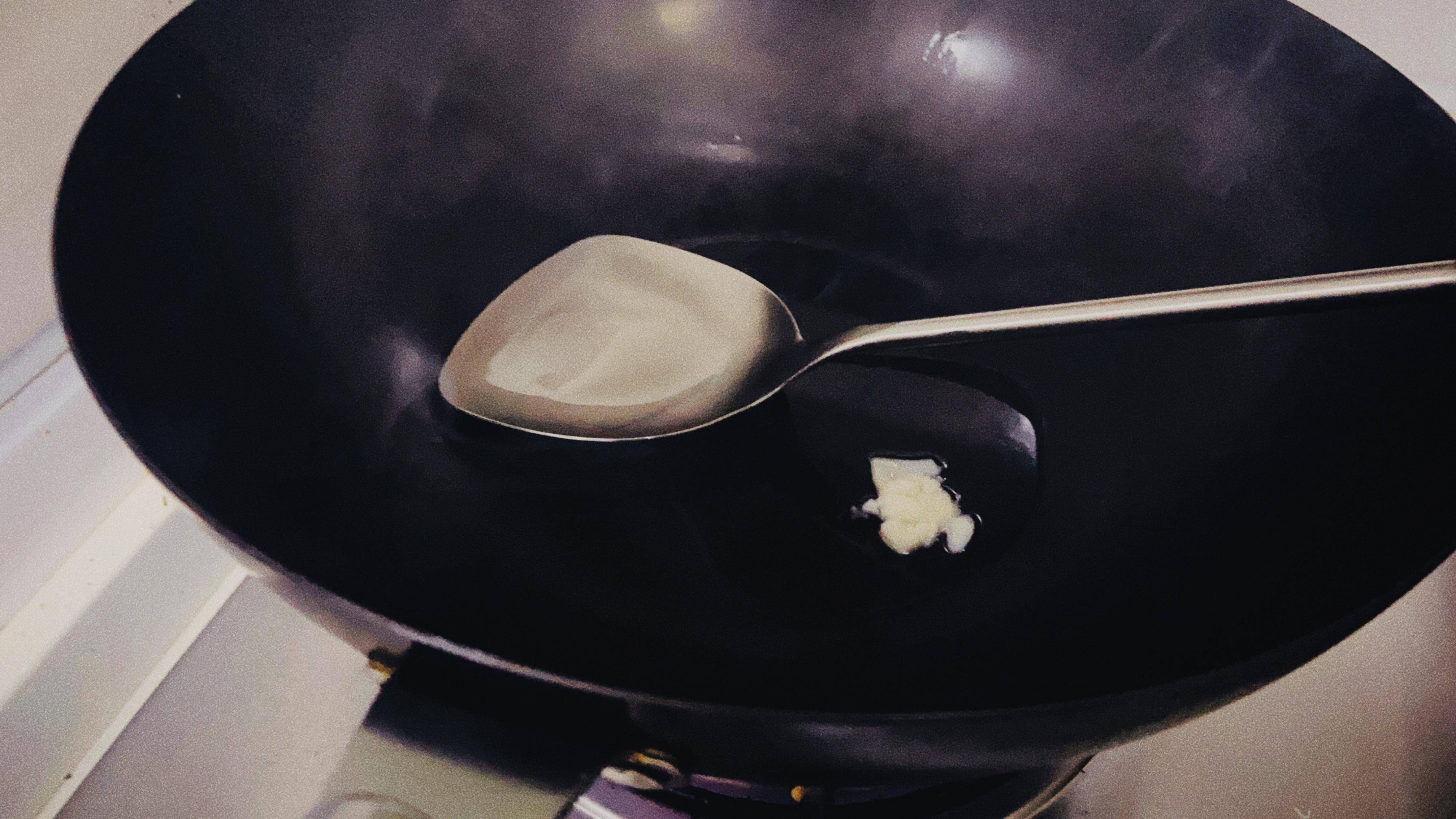锅里加一点猪油,炒土豆我喜欢用猪油来炒。