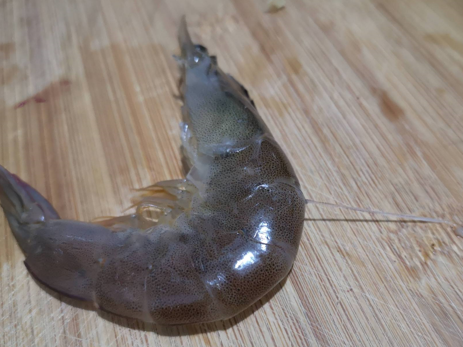 2、虾须和虾枪处理好后,取一根牙签,从虾背的第二关节处挑出虾线。这只虾比较干净,虾线看起来很干净,但也是要去除的。