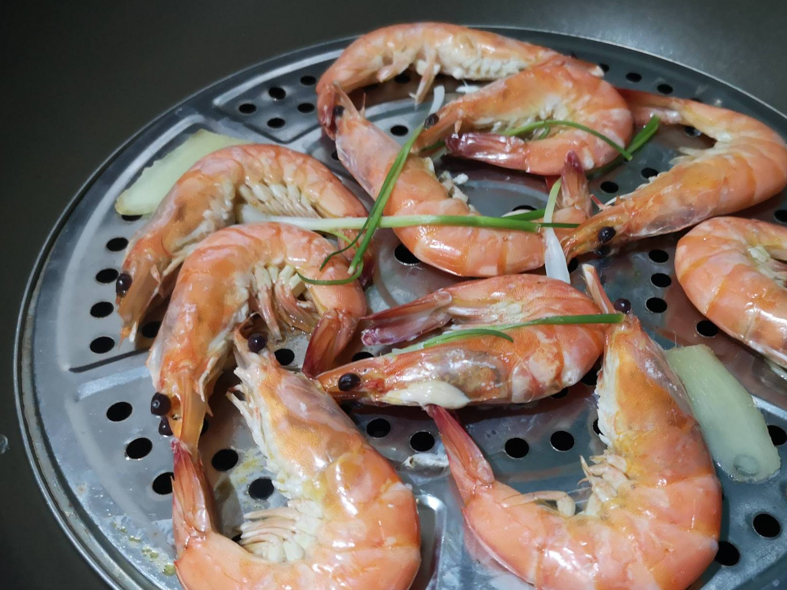 5、水开后放上一个蒸篦或是带孔的蒸盘,将处理好的虾放入,再放一些葱姜进去。