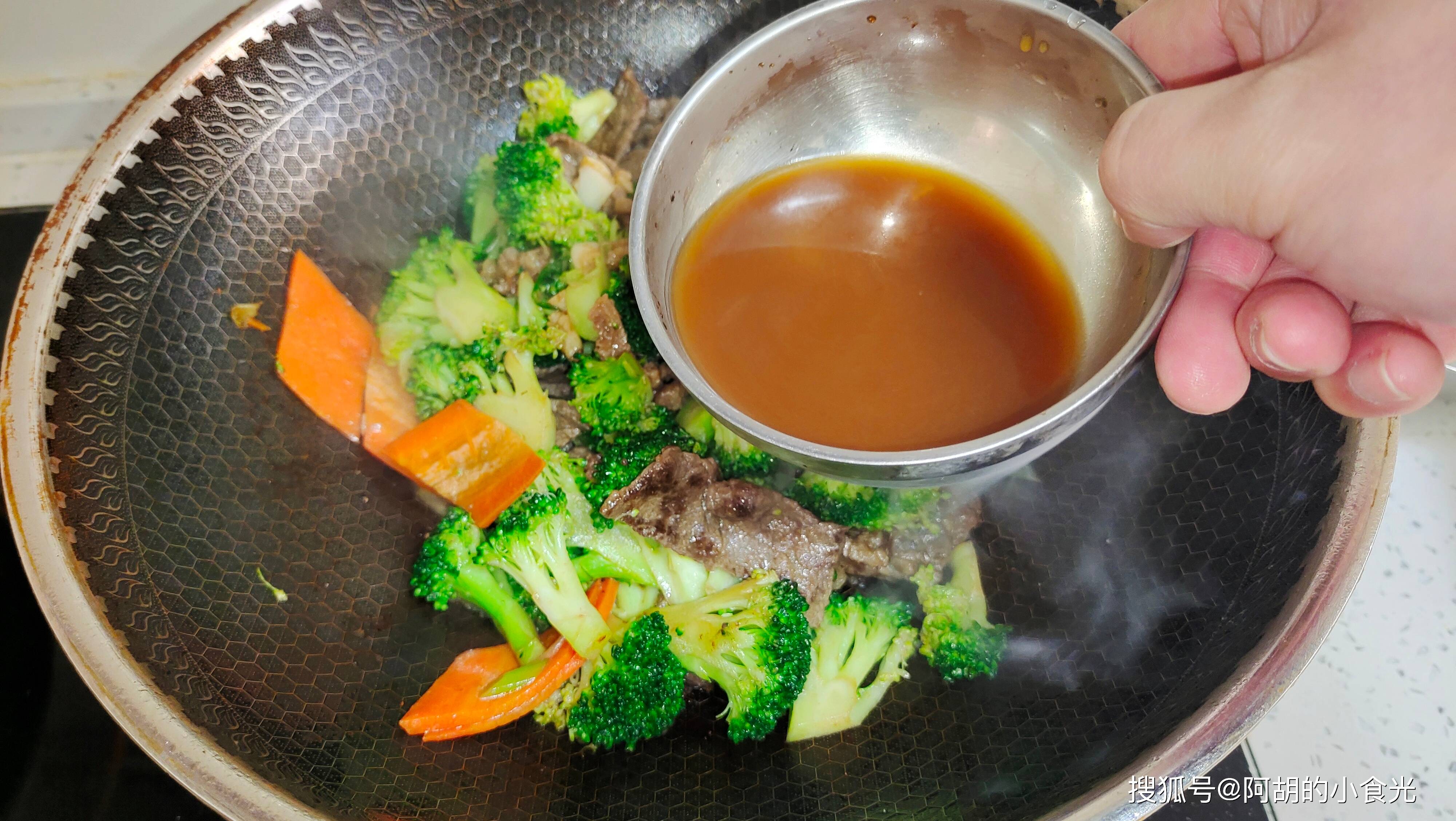 第五步:取出准备好的碗汁,搅一搅使其均匀,而后慢慢淋入锅内,再大火翻炒均匀,让汤汁裹住西兰花和牛肉就可以出锅了。肉嫩菜香入味,有菜有肉营养丰富,配上一碗米饭才叫过瘾。