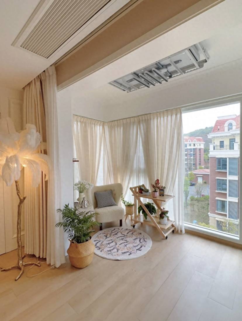 阳台封窗后,客厅拥有了大大的落地窗,搭配了奶茶色系的纱帘,梦幻又能遮挡部分的阳光。重点这个纱纱帘装饰效果真的特别好,将窗帘拉到角落里,摆上小沙发特别出片。