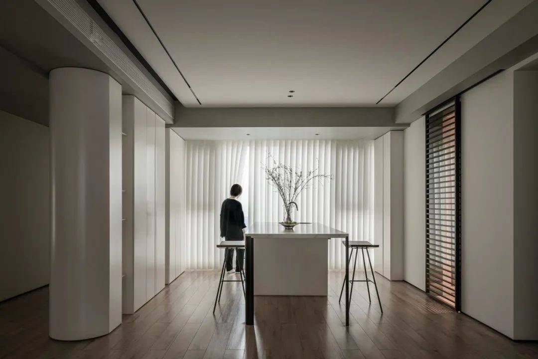 站在走廊上,通过柜门之间的留空,望向餐厅厨房,没有了压迫感。