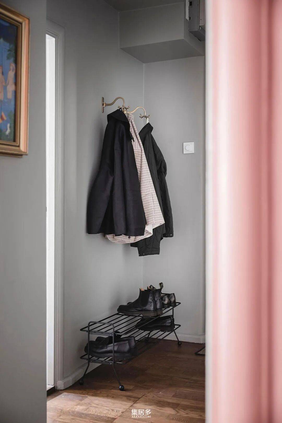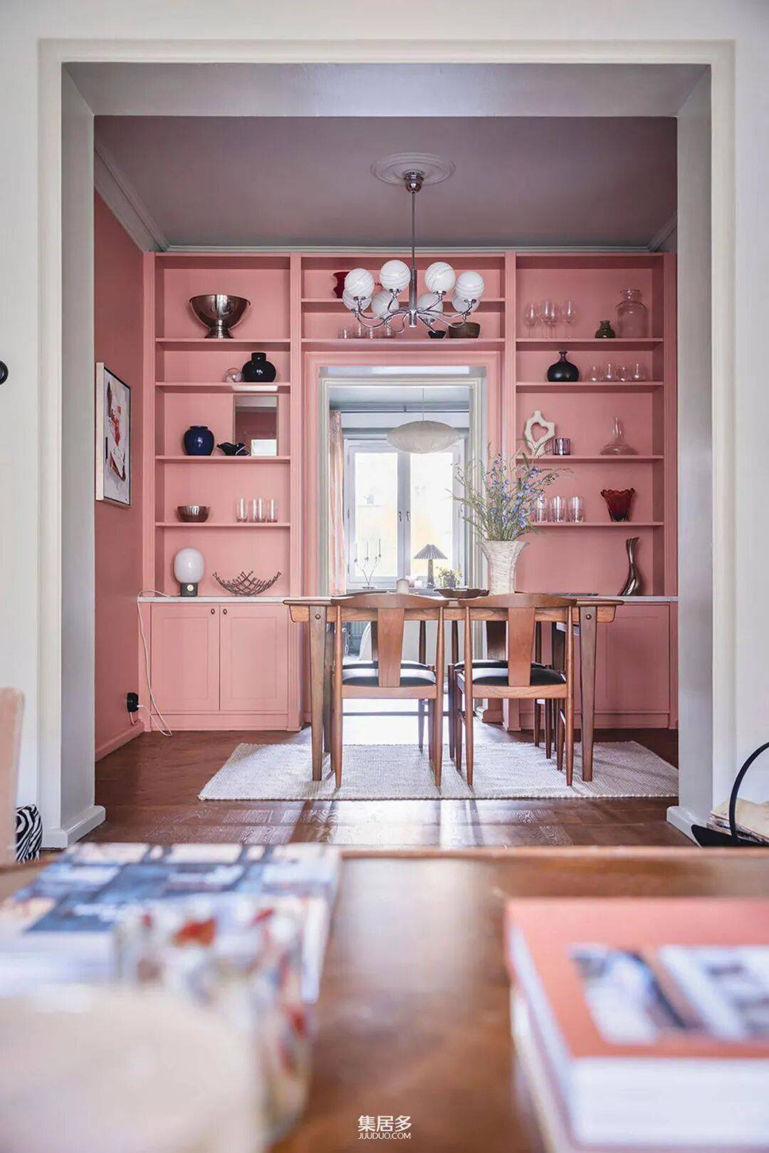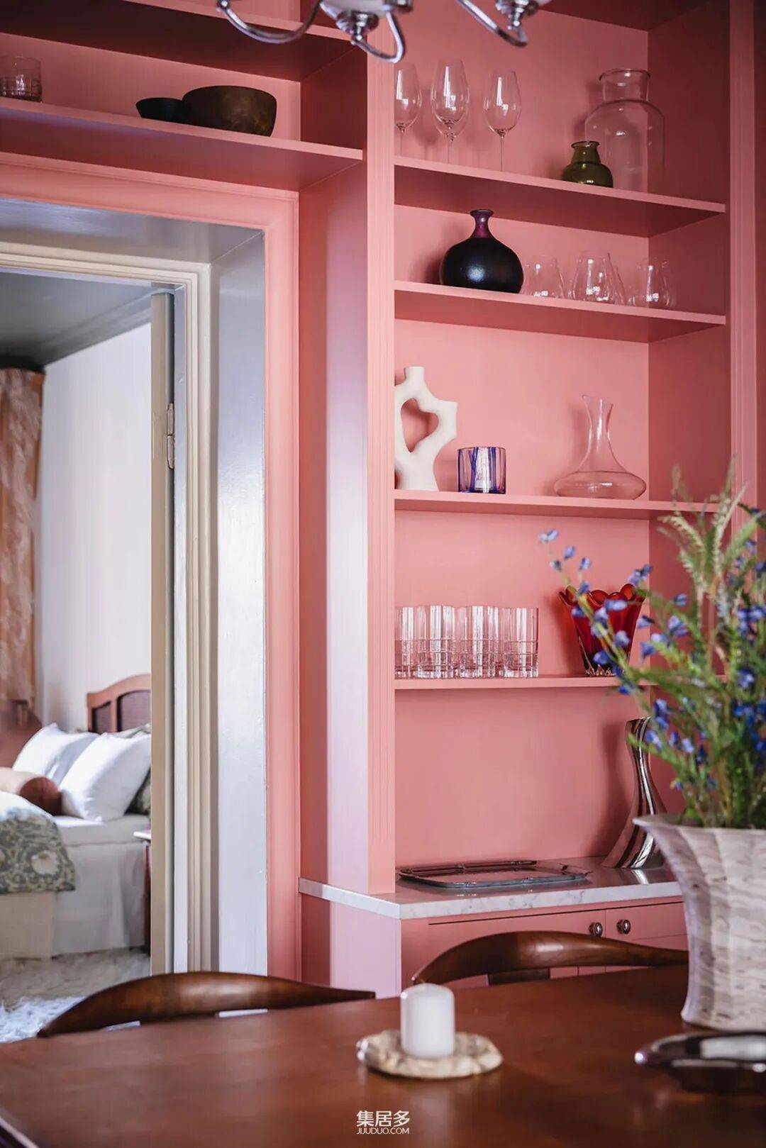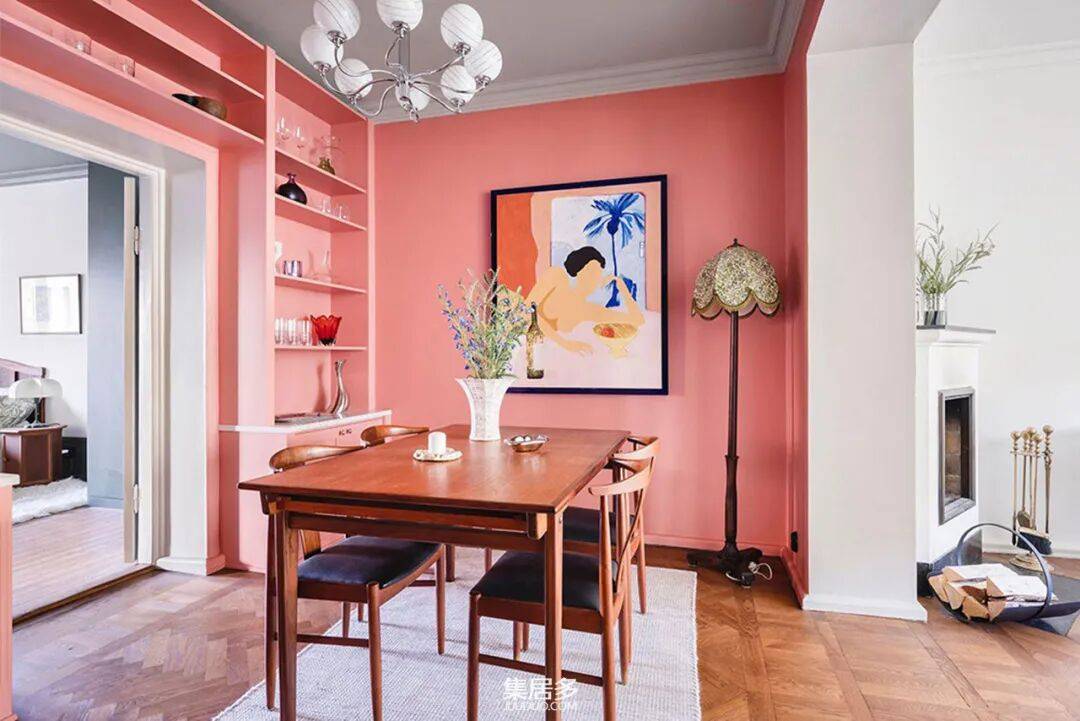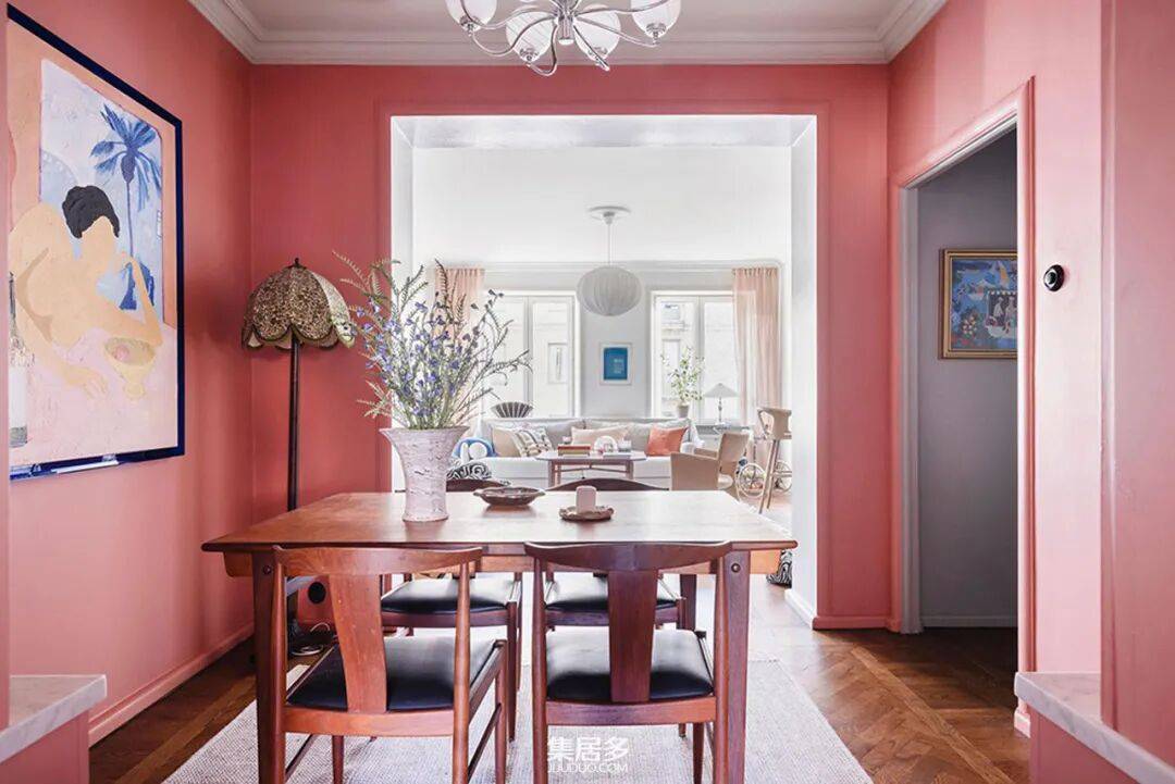 穿过走廊,步入式餐厅以其独特的配色方案令人过目不忘。墙面被粉嫩的色彩温柔包裹,而上方的天花板则选用深灰色,在柔美中注入了沉稳的现代感。这种对比既定义了空间区域,又增添了视觉层次。