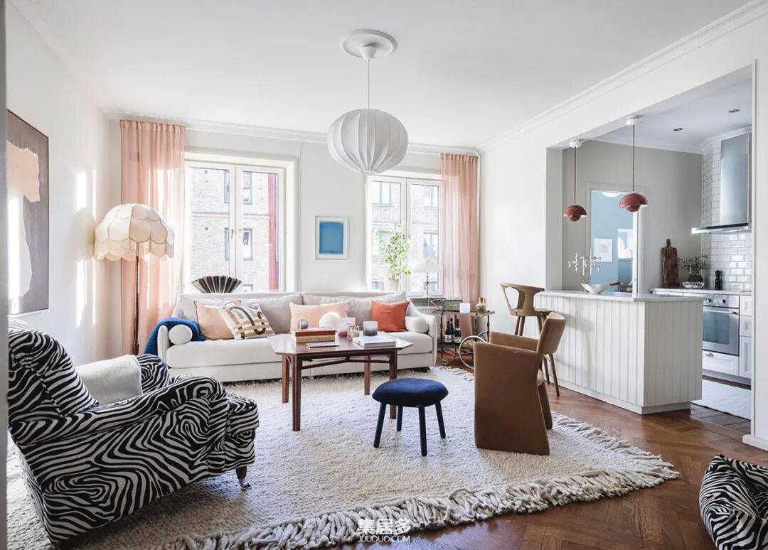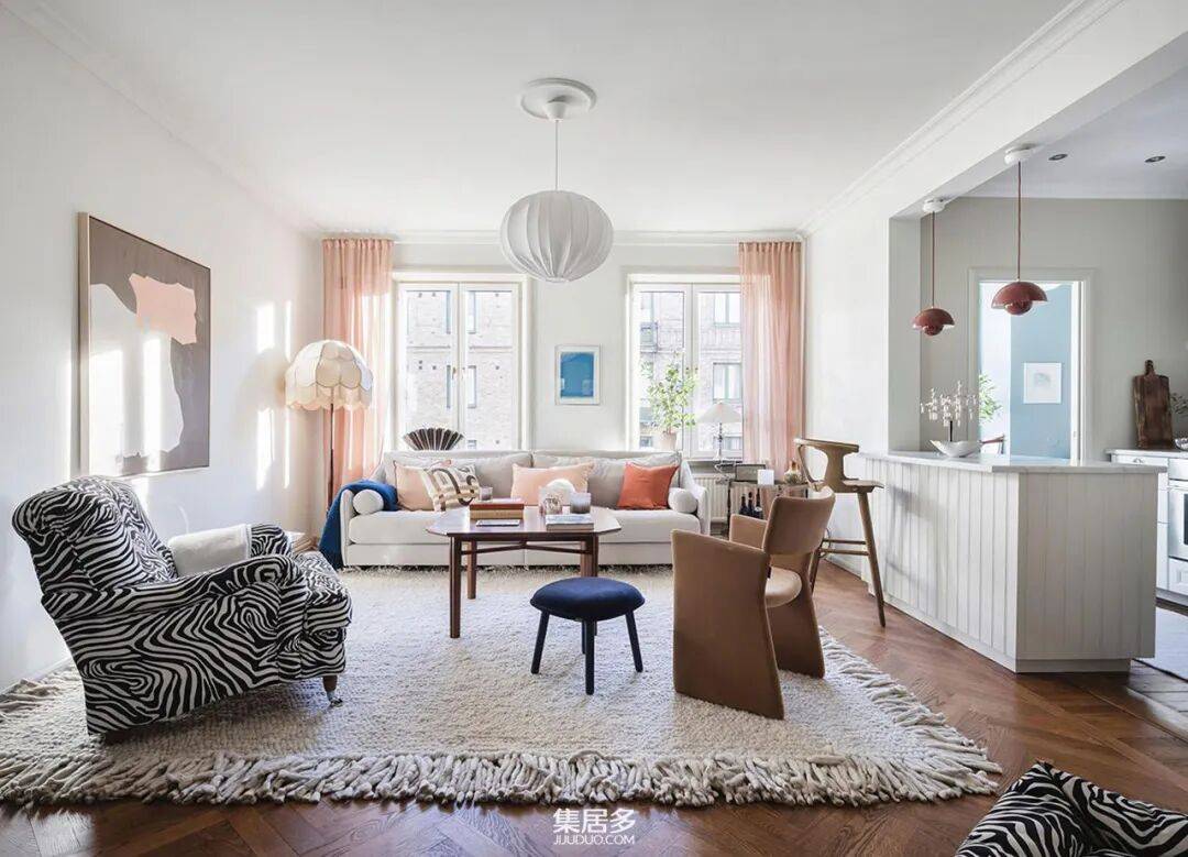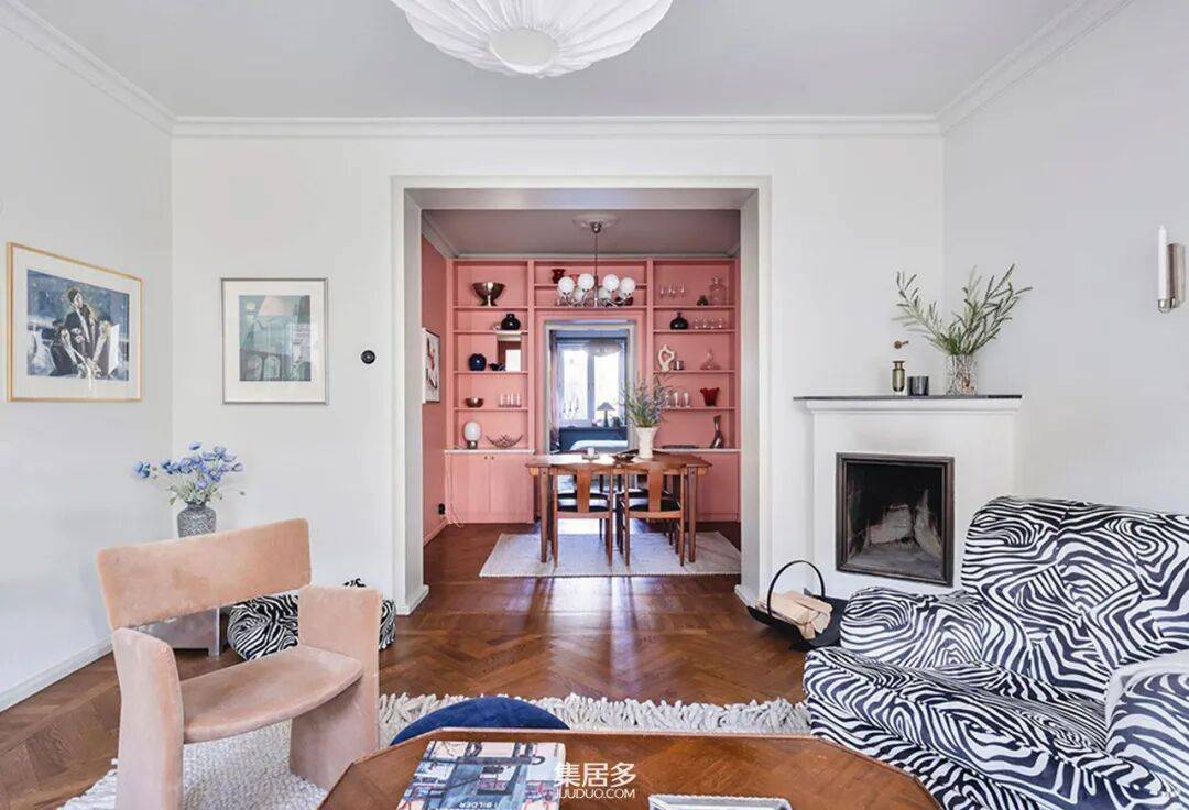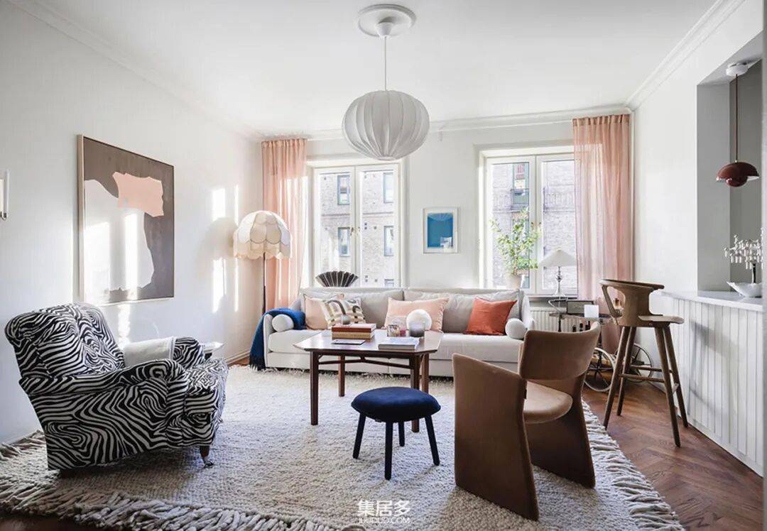 客厅成为整个家的活力中心。一张素色沙发因一系列彩色几何靠垫而瞬间生动,与柔和的粉色窗帘形成了巧妙的呼应。墙上装饰着精选的艺术海报,而最引人注目的莫过于一张斑马纹扶手椅——它不仅是舒适的休憩角落,更是空间中充满野性与现代感的视觉焦点。这些元素看似随意,却在色彩与质感上达成了和谐的统一,营造出富有表现力却不显杂乱的氛围。