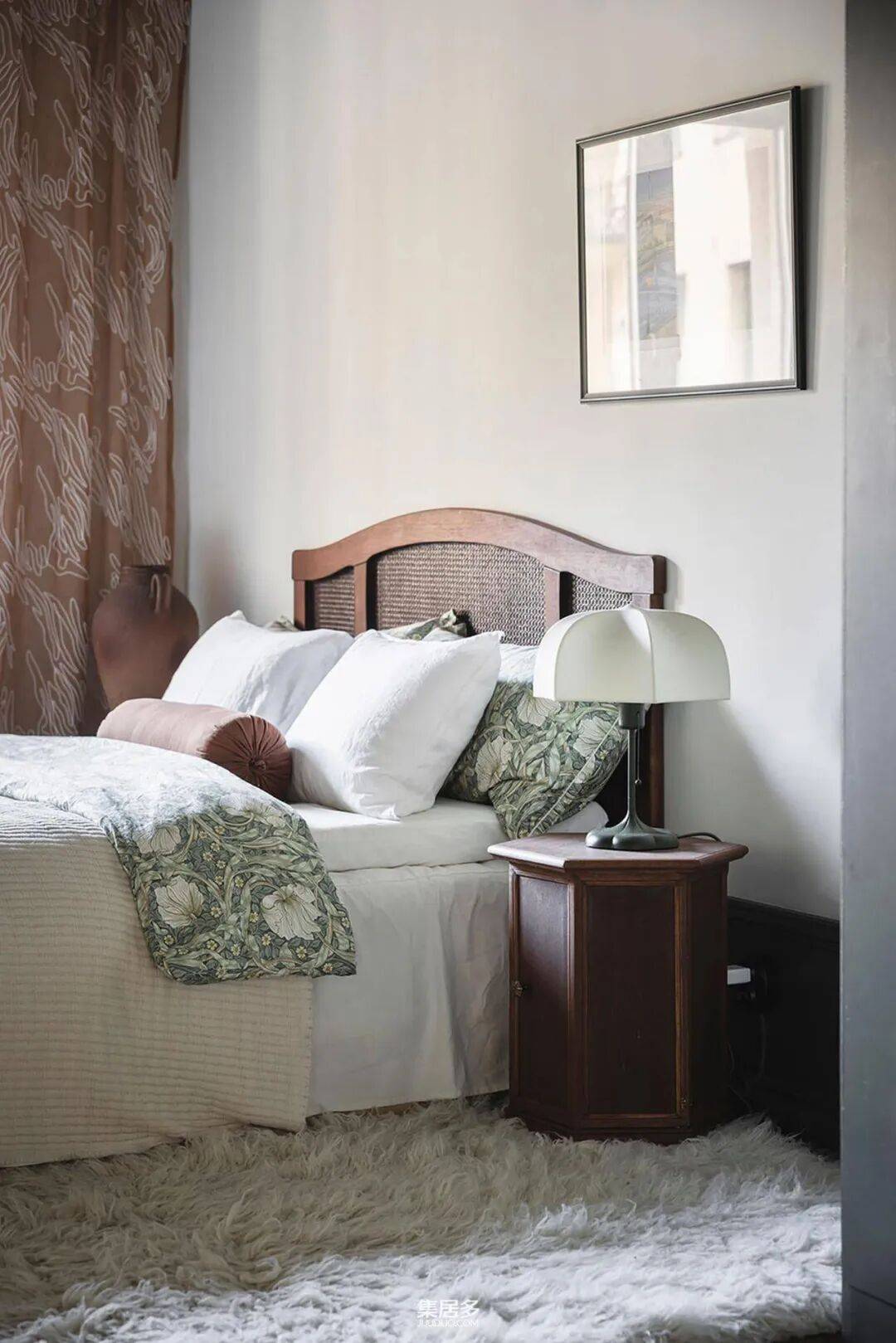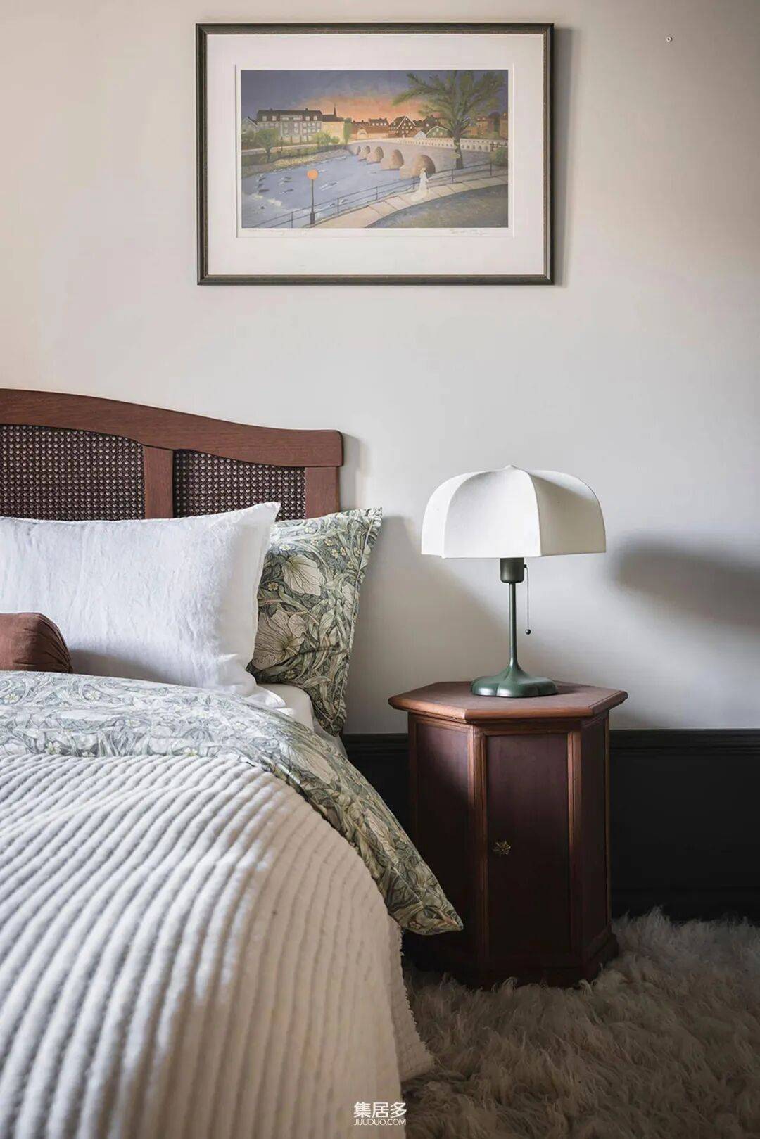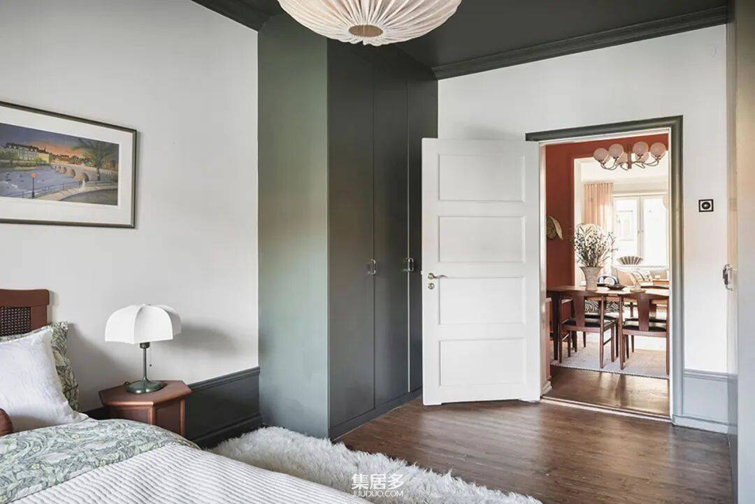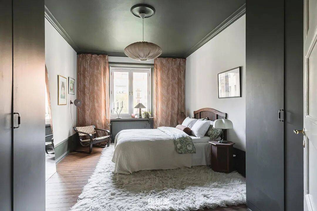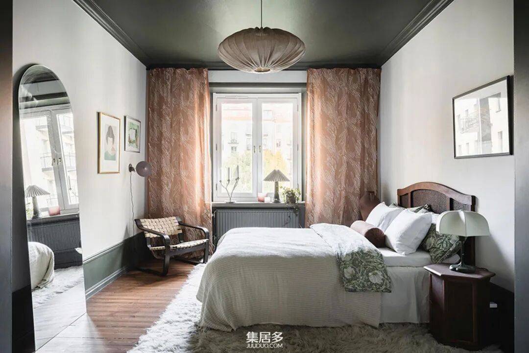 卧室则展现了另一种戏剧性魅力。深黑色的天花板赋予空间一种亲密而沉浸式的包裹感,与造型艺术感十足的特色床头板形成强烈对比,营造出宁静且富有张力的休憩氛围。
