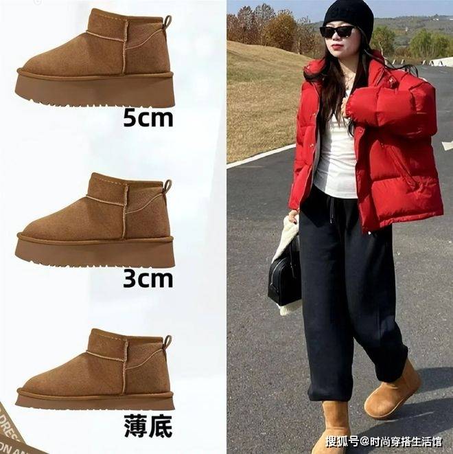 另外要选择鞋底有厚度的雪地靴,这样不仅能够实现整体搭配的重量感平衡,同时也可以用这样的靴子去实现增高目的,而且鞋跟的厚度最好在3到5厘米的区间,如果太低,增高效果会差一些,太高又容易导致鞋底太厚产生很重的堆积感。