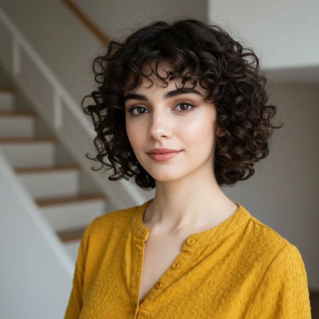 深褐色的发色自带复古滤镜,搭配一件明黄色的上衣,瞬间将人拉回上世纪六十年代的时尚画报里。这种发型尤其适合发量偏少的女性,密集的卷度从视觉上丰盈发量,让头顶呈现出饱满的“云朵感”。日常打理时,只需用保湿定型的弹力素均匀涂抹在发丝上,轻轻抓揉出卷度,就能复刻出“从复古电影里走出来”的精致感。