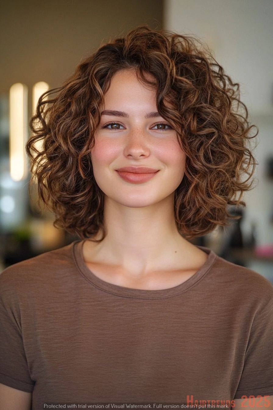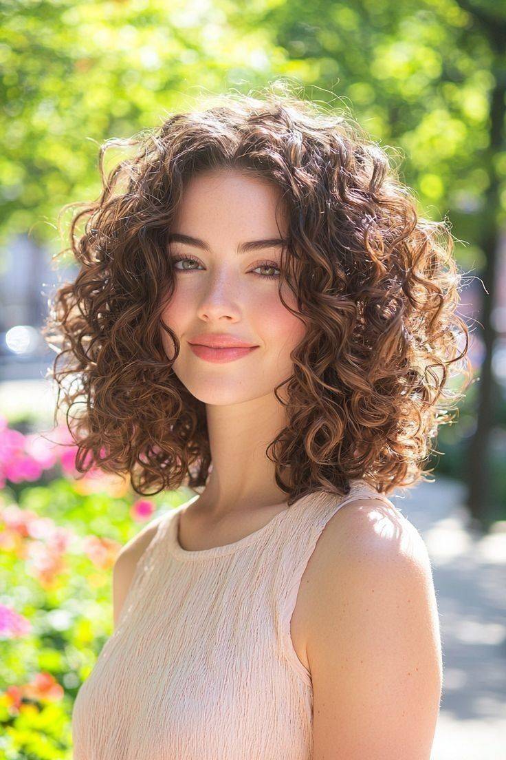 暖棕系自然波浪中短发是其中的典型。卷度以自然的大波浪呈现,从头顶自然过渡到发尾,暖棕发色在光线里泛着细腻的光泽,搭配一件浅杏色无袖上衣,站在绿植繁花的户外场景里,仿佛是把“法式慵懒”穿在了头发上。