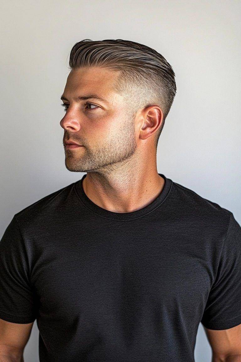 除了经典寸头款,渐变发型的细分风格更能适配多元场景。渐变侧分油头将复古与利落完美融合,两侧采用高渐变设计,从鬓角的极短逐渐过渡到头顶的5-8mm长度,顶部头发用发蜡服帖梳理成侧分线条,发丝整齐有序,既有传统油头的优雅质感,又因渐变层次减少了厚重感,适配西装革履的商务场合,也能驾驭日常通勤的简约穿搭。