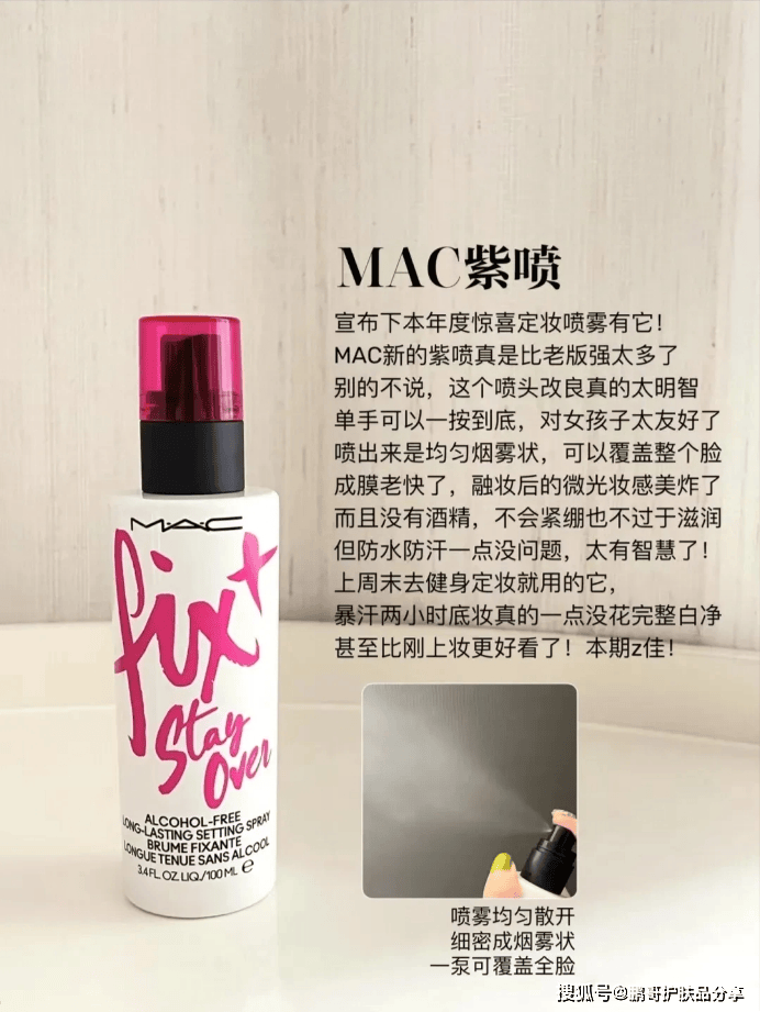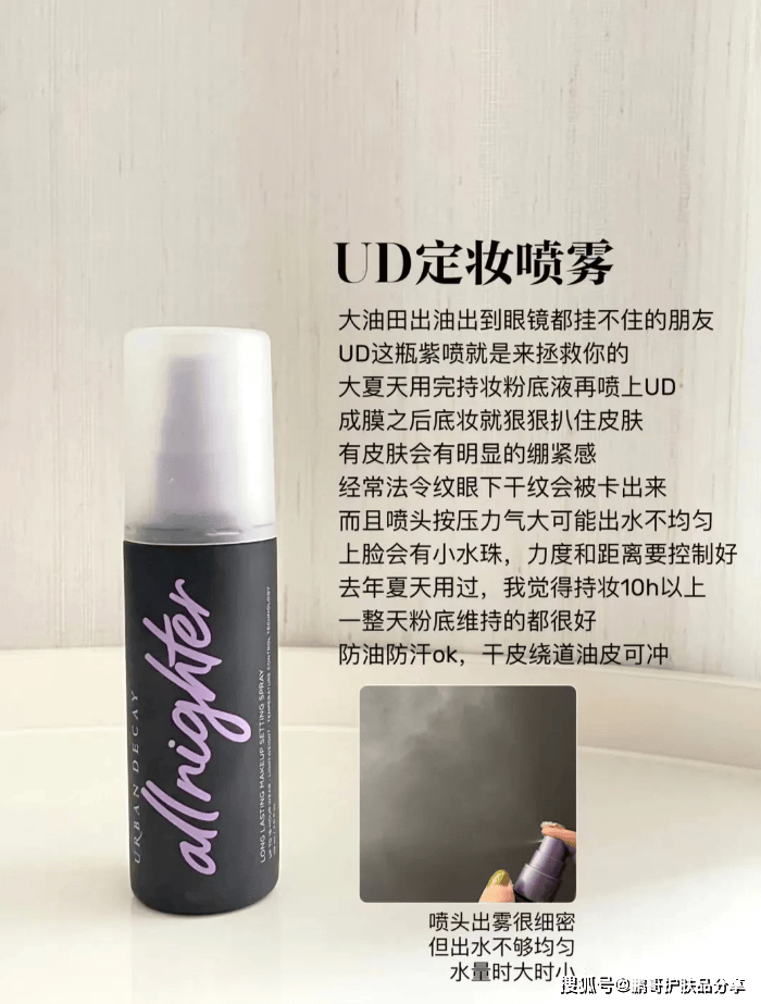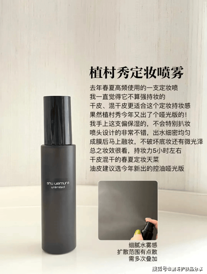 日常用,帮助减少出油,妆也不易蹭花...,水雾不算细腻,喷的时候要拉开一点距离,成膜很快,是带微微光泽的自然妆感。不挑肤质,一年四季都很适合。