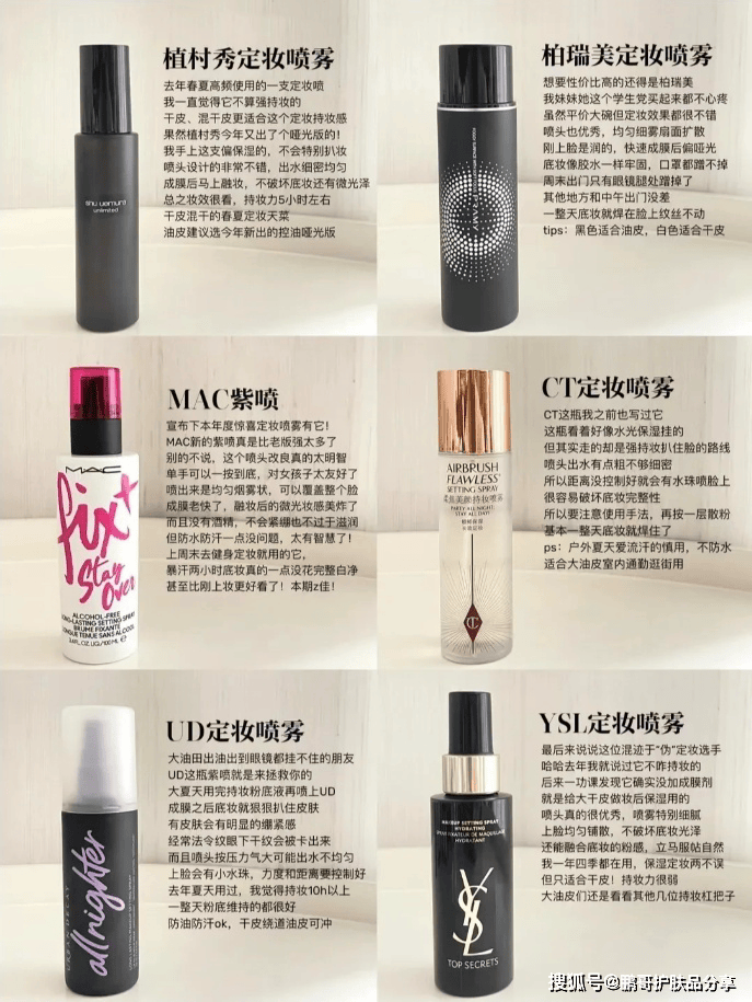 虽然说,定妆喷雾使用起来比较方便,但想用好它也不是那么容易,除了你自己掌握喷法、喷头的大小,定妆的需求以外,更多的还是要回归到喷雾本身的作用,比如说,适合的肤质、有哪些定妆的作用,里面都有哪些成分搭配等等,如果喜欢定妆喷雾的,可以认真的了解一下这6款大牌定妆喷雾,为你的选择提供更多的参考。