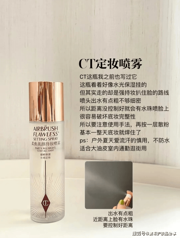 适合油皮、混油,成膜后是雾面哑光的妆效,搭配三明治喷法就是妈生好皮,喷完脸也不会紧绷,去海边玩了,防蹭防水都挺好的,就是用起来感觉喷雾不够细。