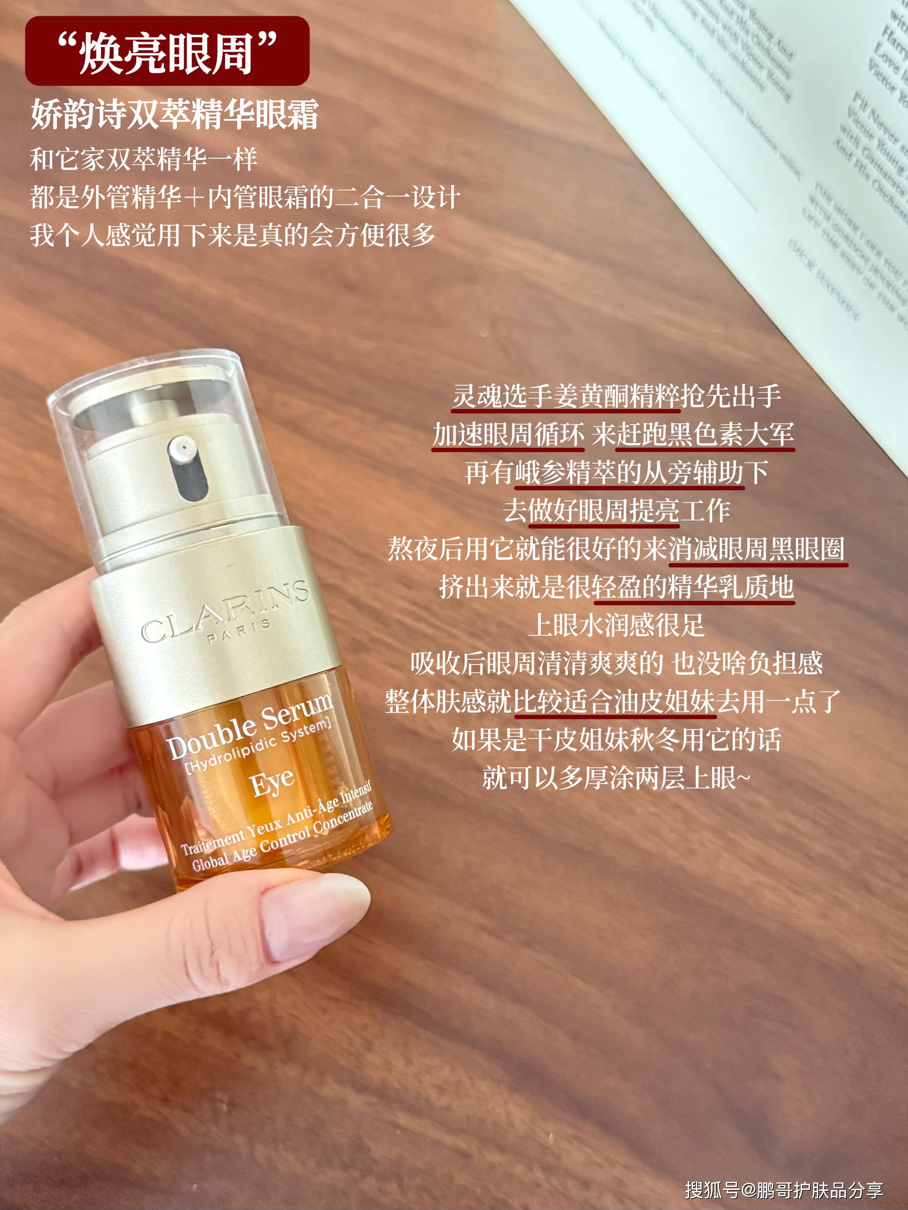 主要作用是改善松弛、充盈细嫩,爱用它家双萃精华,所以又入了眼精华,一边眼精华一边眼霜,抗老buff双开,主打峨参精萃能够滋润眼周,姜黄酮成分能够改善熬夜导致的松垮色沉。