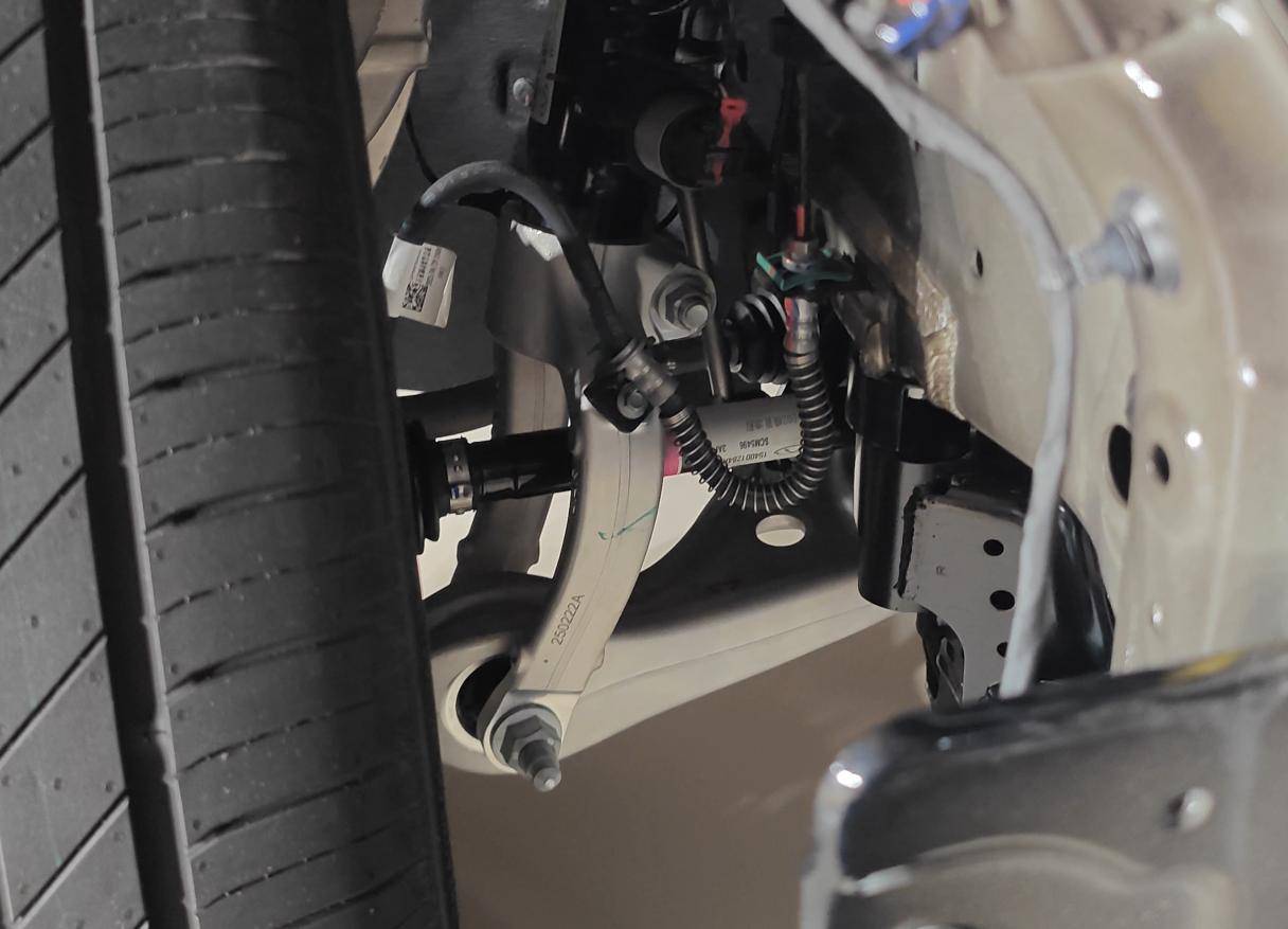 风云T11这次老图拍到的版本,前悬架都是单球节高位双叉臂布局,这和深蓝S09以及吉利银河M9在悬架层面的用料和布局方式基本相同,典型的双叉臂设计,而且没有解耦,在智界R7上,奇瑞是做过解耦的,这意味着前悬层面,风云T11作为风云旗舰车型并没有使用更高级的解耦形式。
