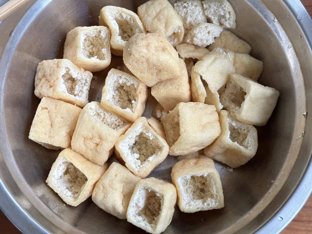 2、准备一些大号的油豆腐,剪掉一面,用筷子把里面的豆腐组织戳碎;