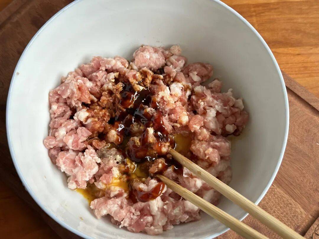 1、准备大概300克的肉馅儿,加半勺海盐、适量的姜粉和白胡椒粉、1勺生抽、少量蚝油、半勺老抽,加入半个鸡蛋充分搅拌至上劲,我还加了2勺大料水进去,搅拌至完全吸收,最后是这样拉丝有劲儿的状态就可以了。