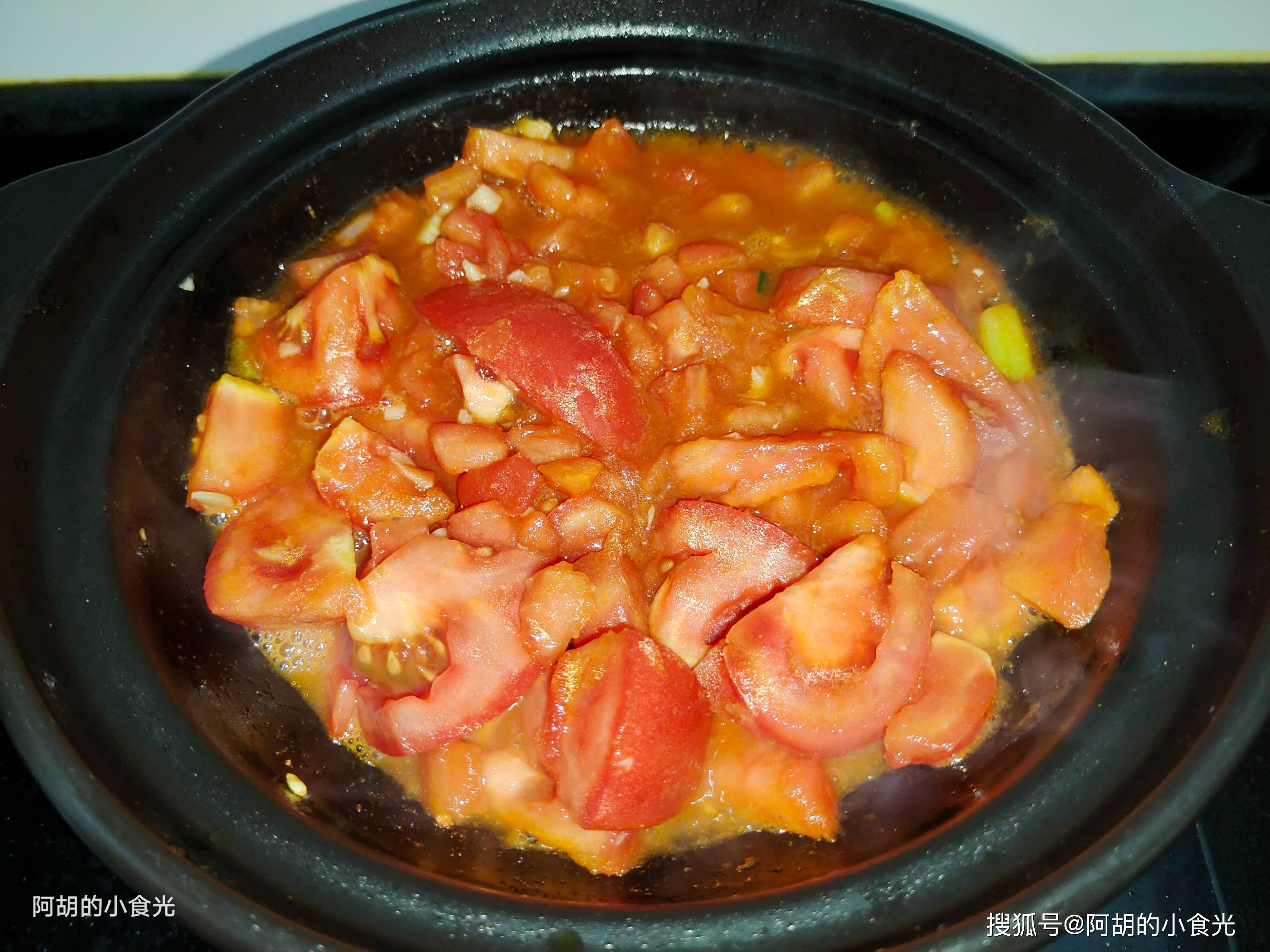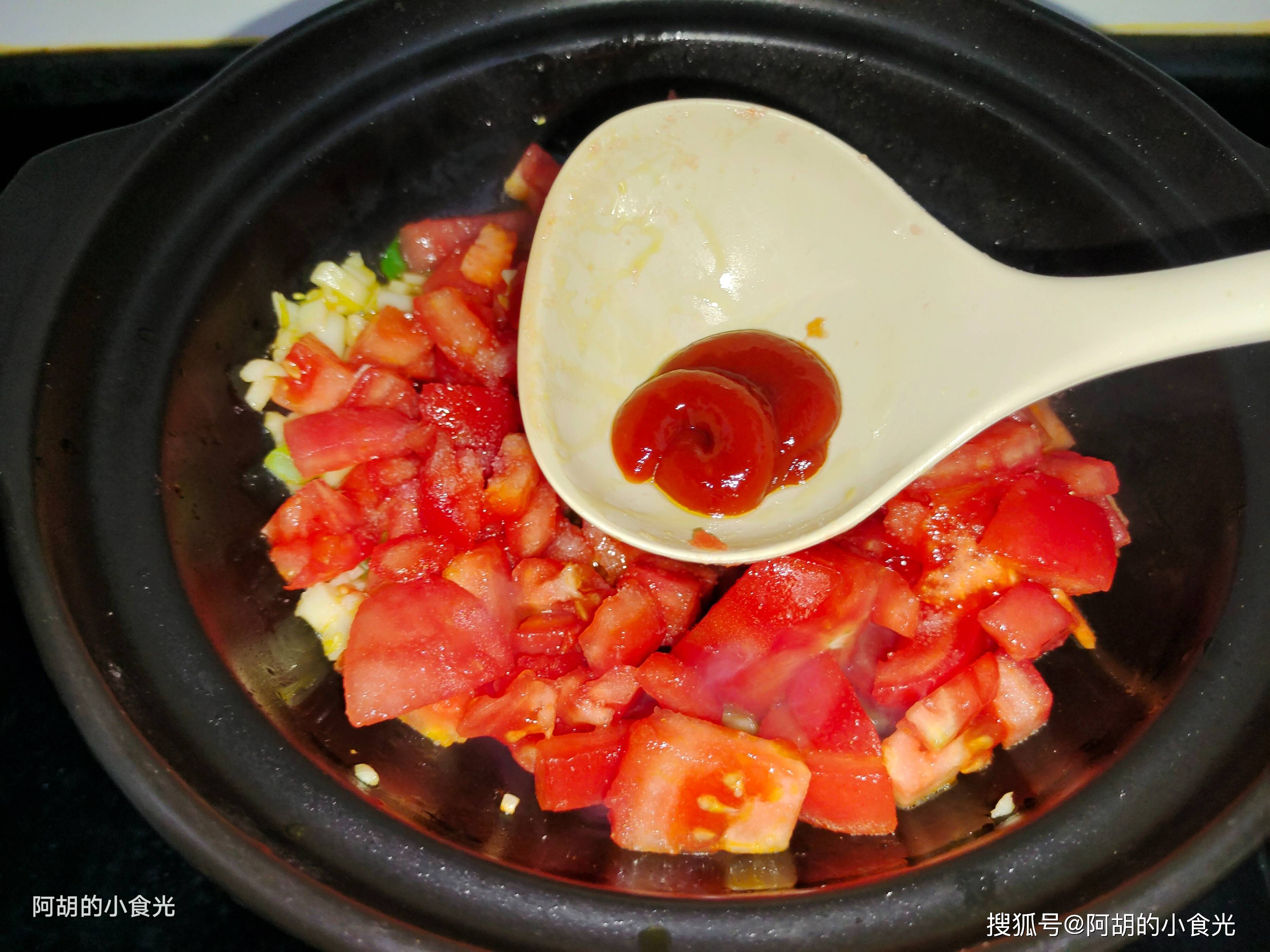 第四步:此时准备一口砂锅,置于灶火上烧热,淋入一些花生油烧热,来一些小料葱蒜末炒出香味,接着把去皮切丁的西红柿下锅炒一炒,炒的时候可以撒入一些食盐促进其渗出汤汁,还可以加入一些番茄酱或者番茄沙司一块炒一炒增加风味,炒出足量的汤汁后就把切块的西红柿也下锅,淋入一圈生抽炒匀。