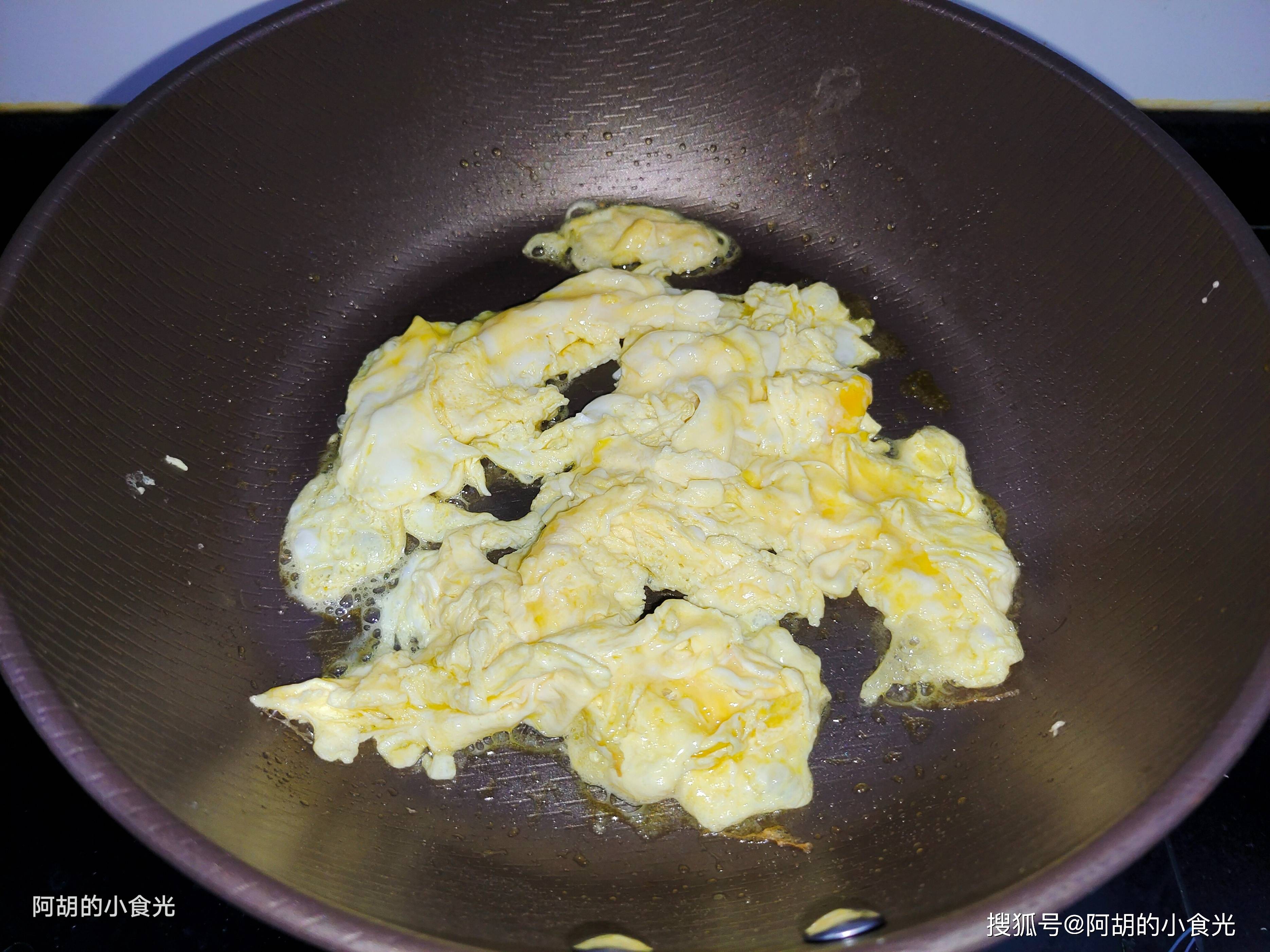 第三步:磕四个鸡蛋入碗中搅散,而后锅里来一些食用油烧热,把鸡蛋液倒入锅中炒至凝固成大块后盛出备用。