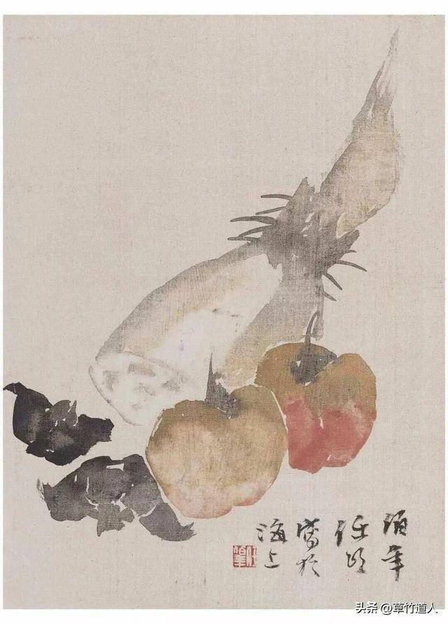 1. 奇崛取势,打破平衡。 他常以对角线、S形曲线或倾斜轴线组织画面,形成强烈的动势。如《酸寒尉像》,吴昌硕身形偏居左下,官帽压眉,双肩内收,整体呈收缩状,与右上方留白形成“上重下轻”的险峻之势,但通过其视线的引导与衣纹的走势实现视觉平衡,增强了画面的戏剧性与心理深度。