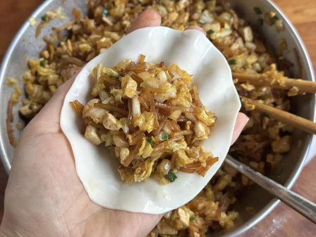 这绝对是懒人厨娘的福音!皮薄到几乎透明,能隐隐约约看到里面丰富的馅料。金黄软嫩的鸡蛋、滑溜的粉丝、脆嫩的娃娃菜,还有吸饱了汤汁的豆腐丁,一口下去,四五种食材在嘴里,那满足感,绝了!