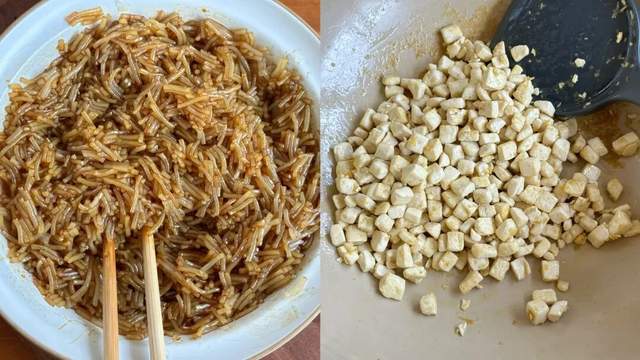 2、粉条提前泡软煮熟,捞出来沥干水分,加入食用油和老抽拌均匀,豆腐丁加在油锅里面翻炒出水分炒至表面微微变黄,盛出来备用。