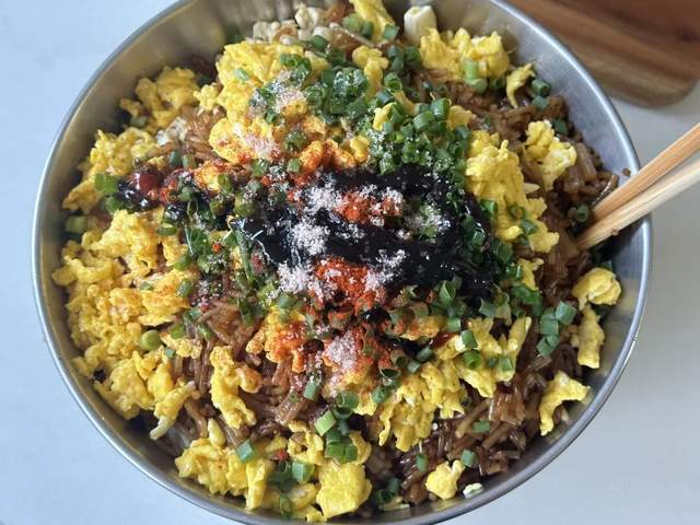 3、加入豆腐丁、粉条碎、2个炒熟的鸡蛋,一大把葱花,浇上热油,适量五香粉、辣椒粉或者甜椒粉、蚝油、海盐拌均匀;