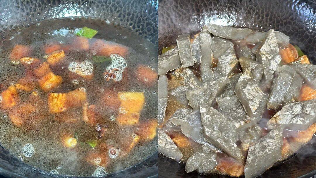 红薯淀粉真是个宝藏食材,平时不起眼地待在厨房角落,可一旦遇上水,在锅里那么一搅一煎,瞬间变身成诱人的肉饼。切成小块后,它们就像海绵宝宝一样,等着吸收所有美味精华。