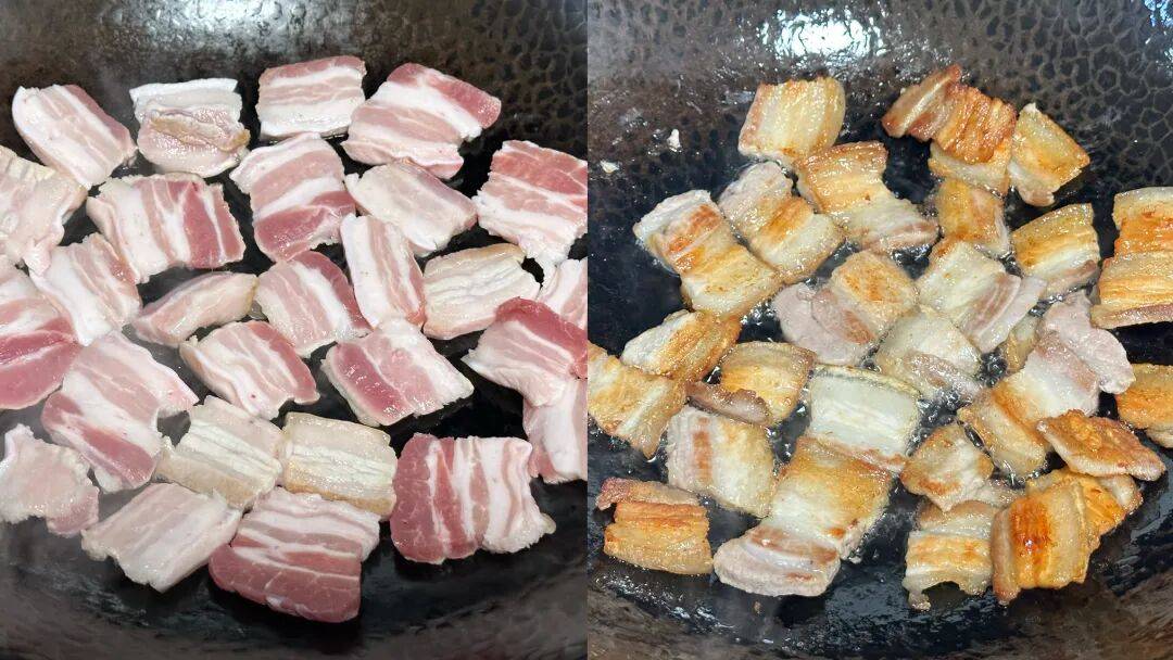 2、五花肉切成薄片,不加油,热锅下锅,把五花肉煸炒出油脂,这样炒出来的菜不腻还好吃,五花肉煸炒至金黄色,油脂也足够了;