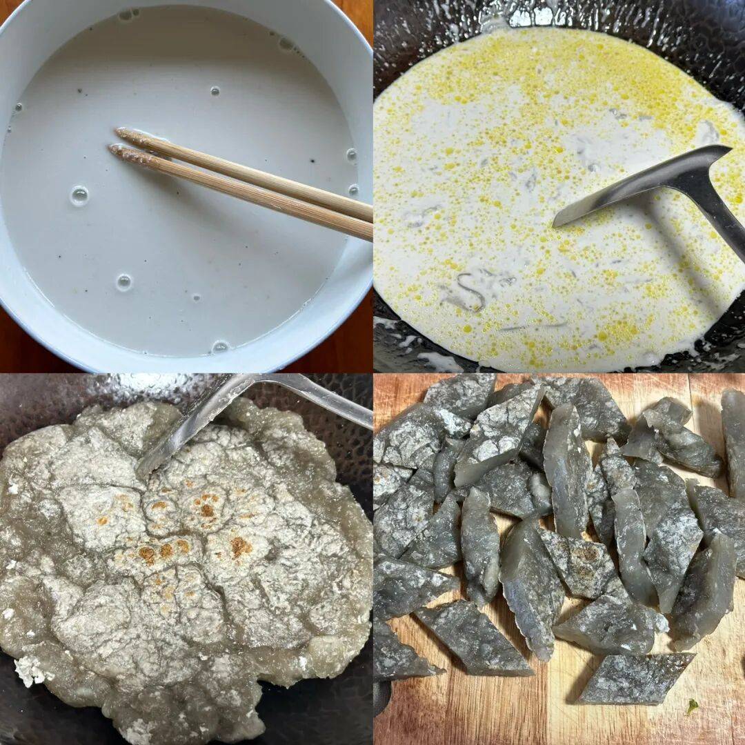 1、准备一碗红薯淀粉,这里要纯的红薯淀粉,最好是农家的纯红薯淀粉。大概比例是1:1.5,混合搅拌均匀,热锅凉油,再把淀粉水倒进去,不停的搅拌,成团之后按压成一个饼,煎至两面微微焦黄色,出锅切成小块就可以;尽量按压薄一点,我第一次做有点厚了,但是口感还是不错的!