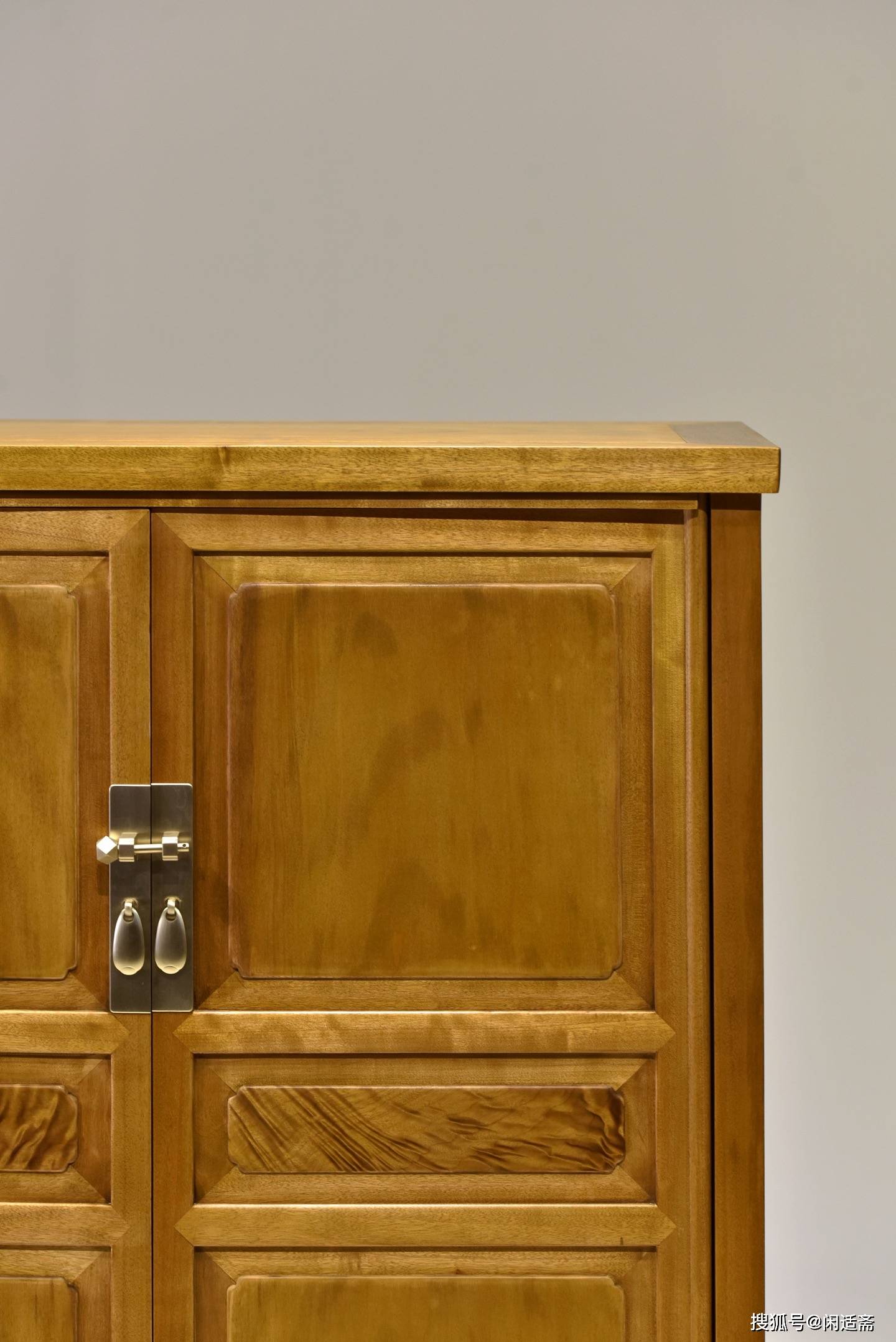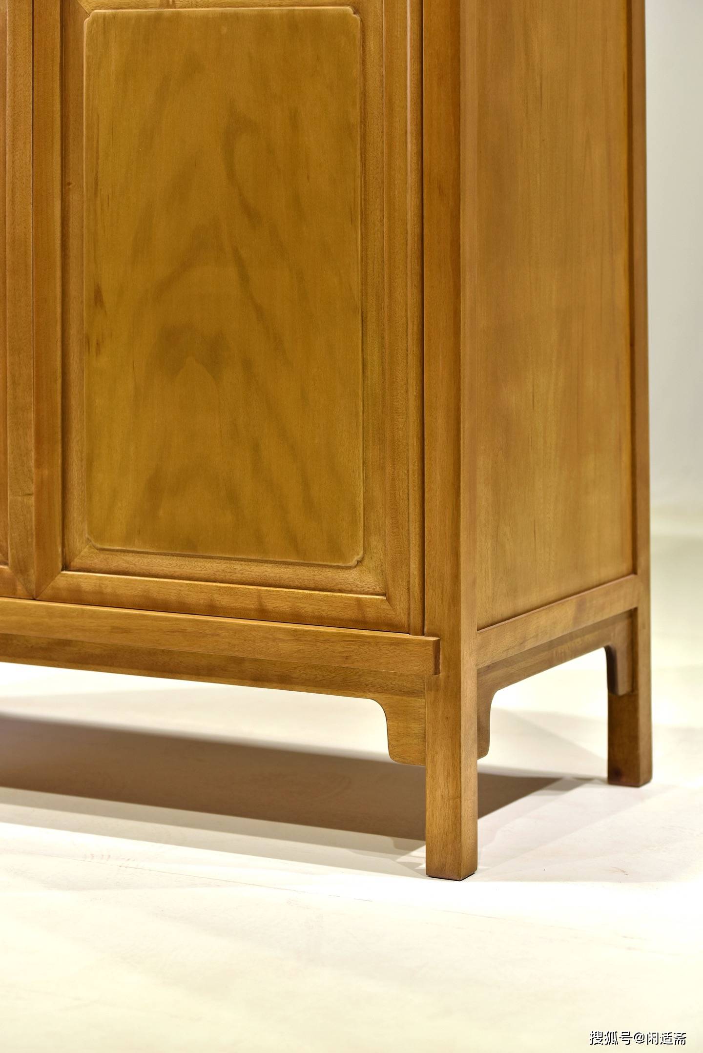 框架采用全传统榫卯结构攒接,柜帽与腿足、柜门与柜体的衔接严丝合缝,无一枚铁钉,既保证了结构稳固耐用,又让整体造型浑然一体。方材腿足线条挺拔,转角处经精细打磨,方中见圆,既保留了方材的沉稳,又兼具圆角的温润,与柜帽圆角过渡呼应,诠释“圆融和谐”的中式处世哲学。
