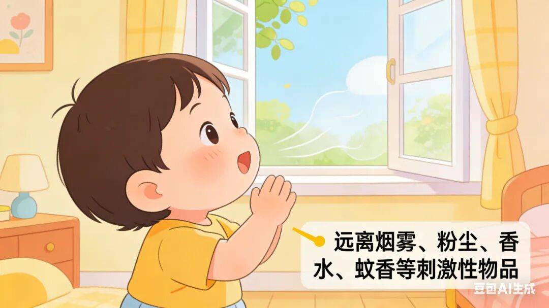 家里要保持空气清新,每天开窗通风2-3次,每次15分钟,把病菌都赶出去,让宝宝呼吸到干净的空气。同时,要让宝宝远离烟雾、粉尘、冷空气和刺激性气味,比如香水、蚊香等。这些会刺激宝宝的呼吸道,让咳嗽变得更厉害。