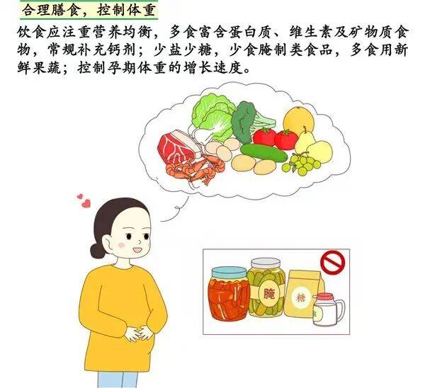 控制体重:每周体重增长不超过0.3kg,整个孕期总增重建议在11–16kg(超重者需更严格)。少吃高油、高糖食物,避免体重增长过快。