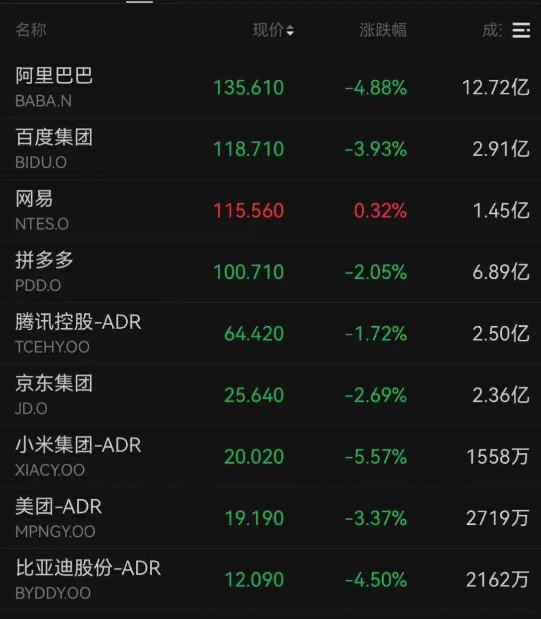 中概互联板块承压。阿里巴巴下跌4.88%,比亚迪股份下跌4.5%,百度、美团跌超3%,拼多多、京东跌超2%。