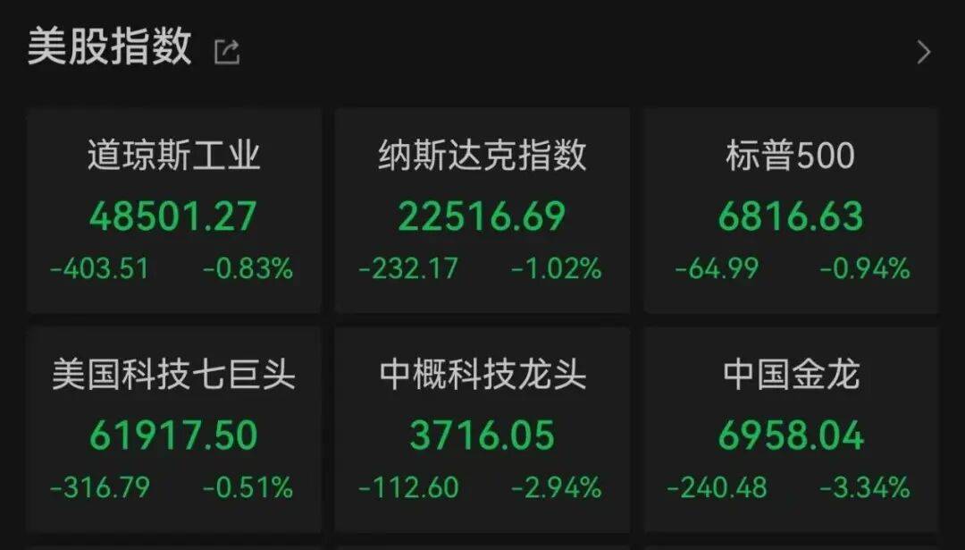 标普500指数的11个板块全面收跌,原材料板块跌2.69%,工业板块跌1.96%,能源板块跌0.94%,电信板块跌0.27%,金融板块跌0.18%。