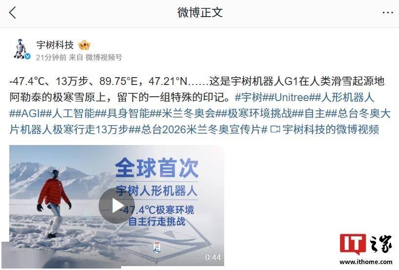 宇树科技官方“认领”了这次挑战,并透露进行挑战的机器人是宇树机器人 G1。其依托北斗卫星实时厘米级导航、具身智能自适应路径规划,在-47.4℃ 的极寒雪原上行走的总行程超 13 万步,并画出了长 186 米、宽 100 米的冬奥雪面图案。
