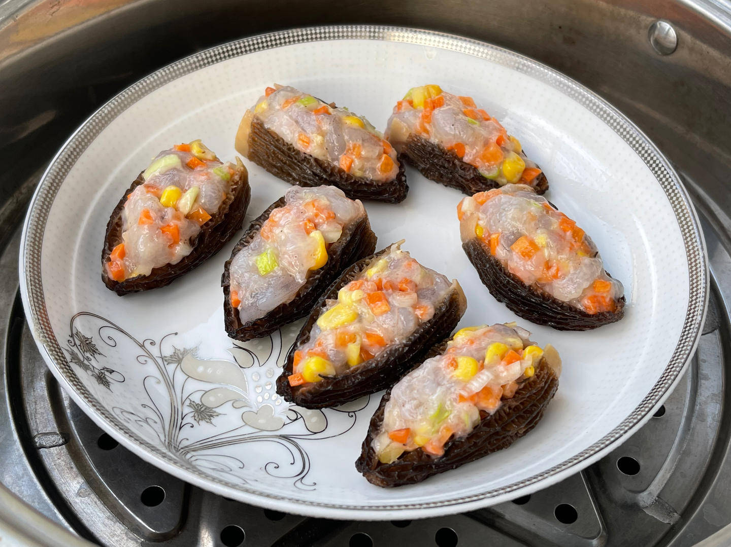 4、将混合好的虾肉放到羊肚菌里边包好,摆入盘中。蒸锅中提前加好水,盘子放进去,大火加热十五分钟,出锅后即可上桌,滋味鲜美又营养。