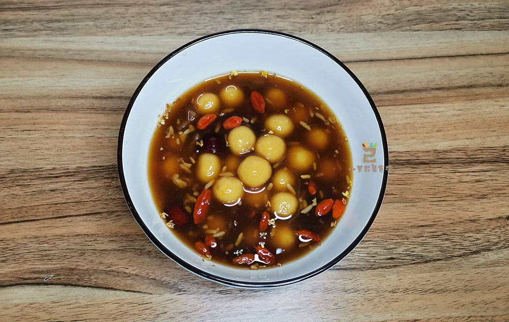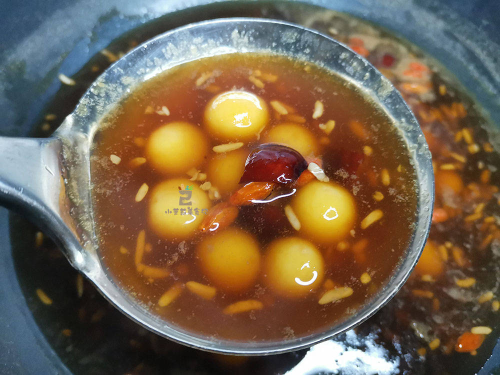 4、锅里倒水,放些枣一起烧热煮开,圆子倒里边,搅拌至飘起来,煮五分钟,加点黑糖,枸杞,搅拌几圈后淋上藕粉或是玉米淀粉水,令汤汁浓稠起来,关火后补充两勺米酒,搅匀后即可盛到碗里享用。