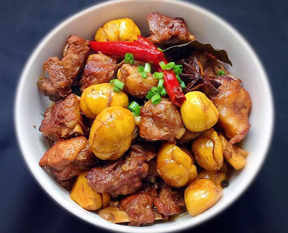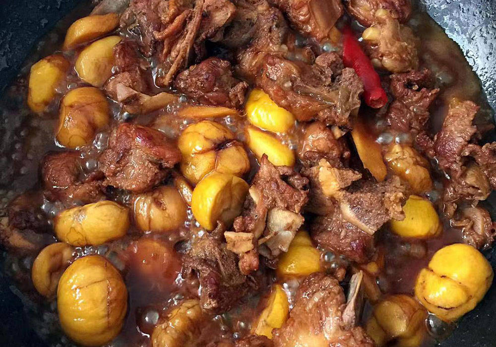 5、排骨先煮一个钟头,板栗倒里边,混合匀后,依然保持小火焖煮,大约四十分钟后,补充些盐,汤汁咸淡适宜后,转为大火炒一会儿,这样会很入味。